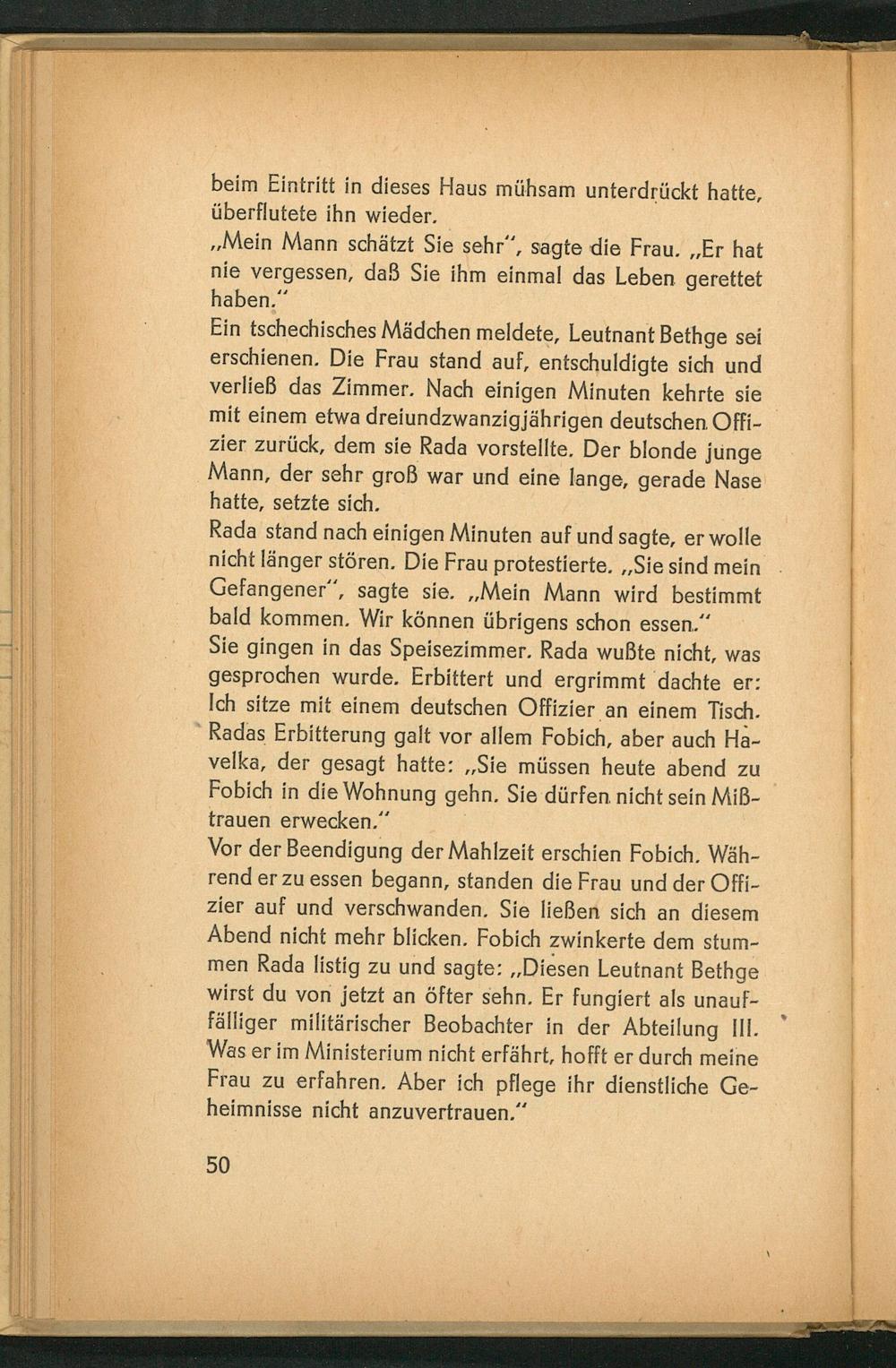 Vor der Beendigung der Mahlzeit erschien Fobich. Während er zu essen begann, standen die Frau und der Offizier auf und verschwanden. Sie ließen sich an diesem Abend nicht mehr blicken. Fobich zwinkerte dem stummen Rada listig zu und sagte: ,, Diesen Leutnant Bethge wirst du von jetzt an öfter sehn. Er fungiert als unauffälliger militärischer Beobachter in der Abteilung III. Was er im Ministerium nicht erfährt, hofft er durch meine Frau zu erfahren. Aber ich pflege ihr dienstliche Geheimnisse nicht anzuvertrauen."