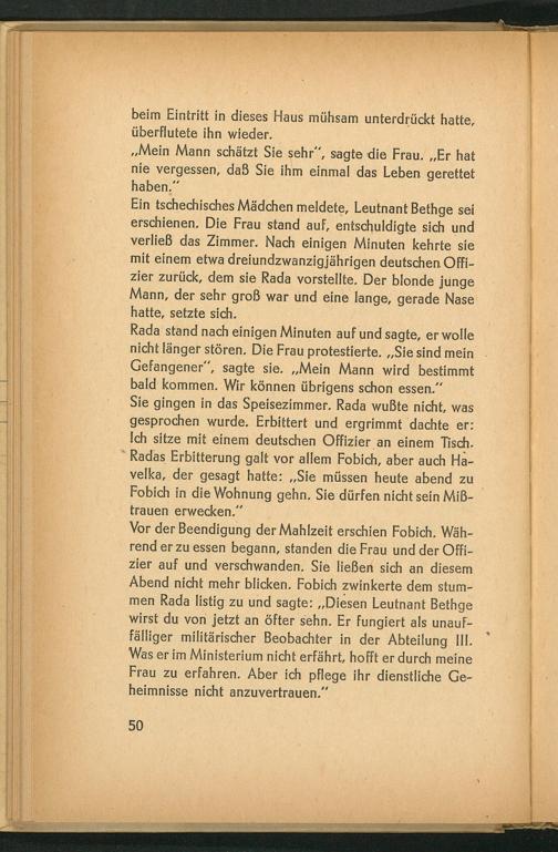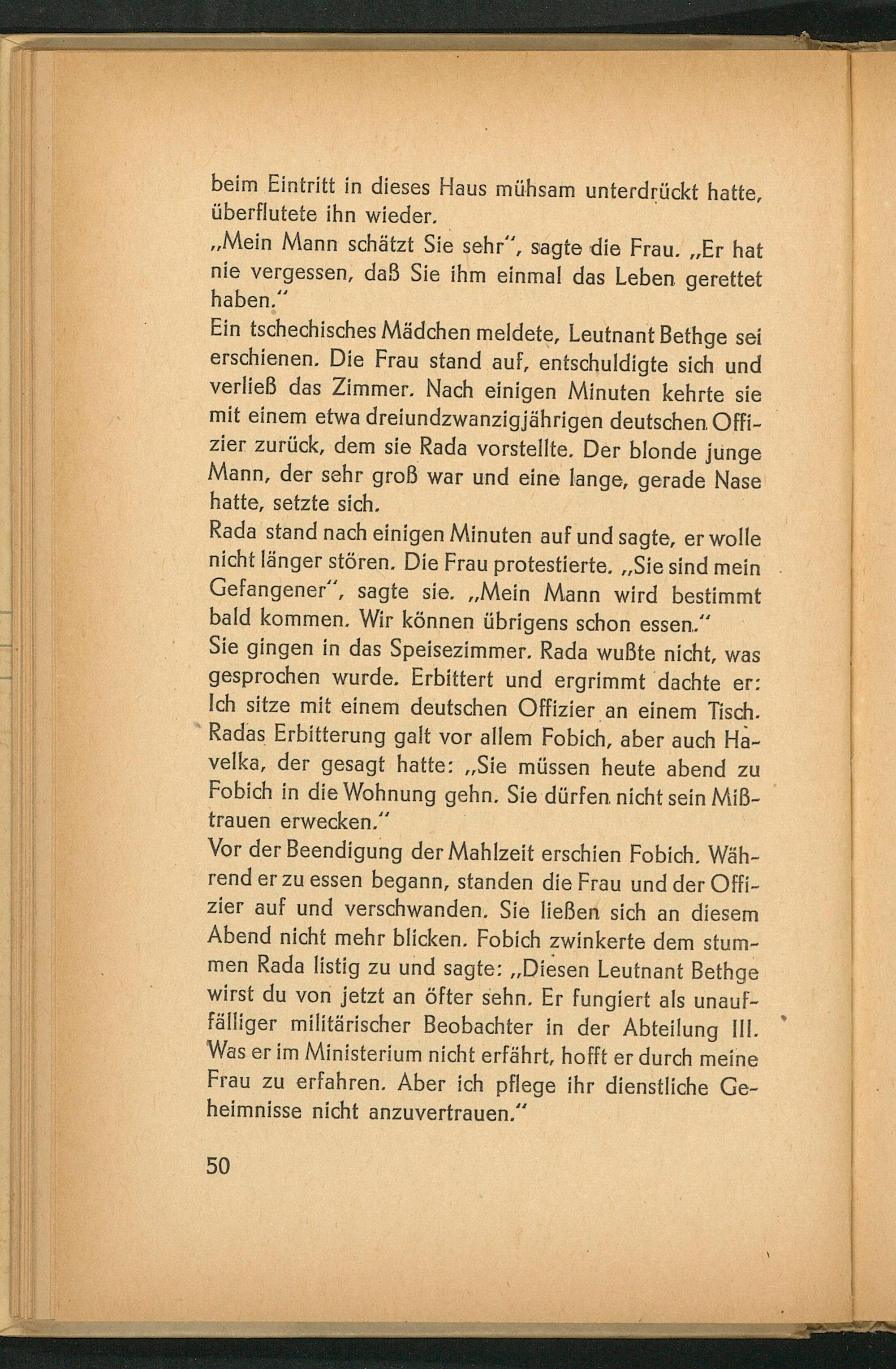 Ein tschechisches Mädchen meldete, Leutnant Bethge sei erschienen. Die Frau stand auf, entschuldigte sich und verließ das Zimmer. Nach einigen Minuten kehrte sie mit einem etwa dreiundzwanzigjährigen deutschen Offizier zurück, dem sie Rada vorstellte. Der blonde junge Mann, der sehr groß war und eine lange, gerade Nase hatte, setzte sich.