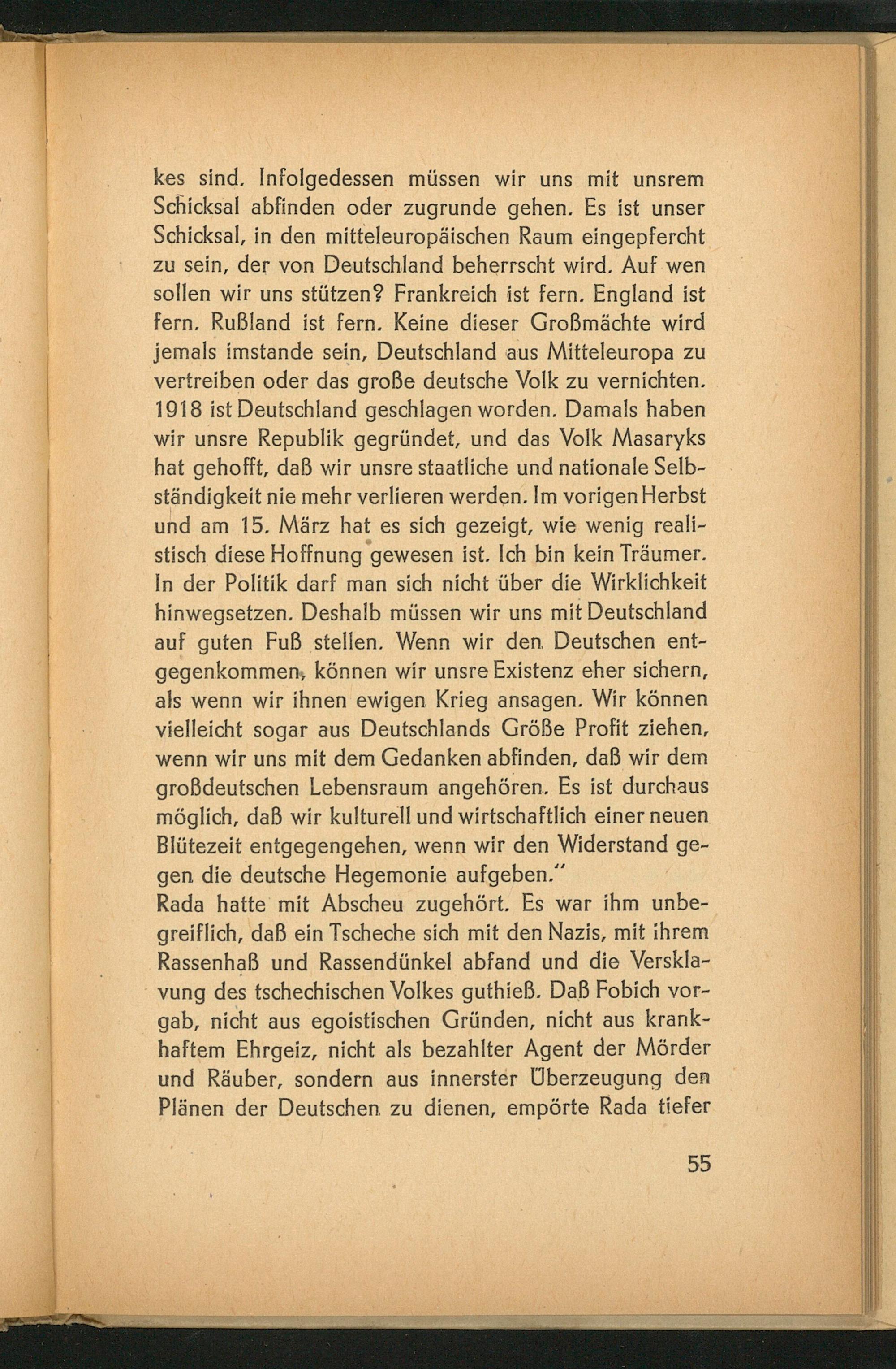 kes sind. Infolgedessen müssen wir uns mit unsrem Schicksal abfinden oder zugrunde gehen. Es ist unser Schicksal, in den mitteleuropäischen Raum eingepfercht zu sein, der von Deutschland beherrscht wird. Auf wen sollen wir uns stützen? Frankreich ist fern. England ist fern. Rußland ist fern. Keine dieser Großmächte wird jemals imstande sein, Deutschland aus Mitteleuropa zu vertreiben oder das große deutsche Volk zu vernichten. 1918 ist Deutschland geschlagen worden. Damals haben wir unsre Republik gegründet, und das Volk Masaryks hat gehofft, daß wir unsre staatliche und nationale Selbständigkeit nie mehr verlieren werden. Im vorigen Herbst und am 15. März hat es sich gezeigt, wie wenig realistisch diese Hoffnung gewesen ist. Ich bin kein Träumer. In der Politik darf man sich nicht über die Wirklichkeit hinwegsetzen. Deshalb müssen wir uns mit Deutschland auf guten Fuß stellen. Wenn wir den Deutschen entgegenkommen, können wir unsre Existenz eher sichern, als wenn wir ihnen ewigen Krieg ansagen. Wir können vielleicht sogar aus Deutschlands Größe Profit ziehen, wenn wir uns mit dem Gedanken abfinden, daß wir dem großdeutschen Lebensraum angehören. Es ist durchaus möglich, daß wir kulturell und wirtschaftlich einer neuen Blütezeit entgegengehen, wenn wir den Widerstand gegen die deutsche Hegemonie aufgeben."