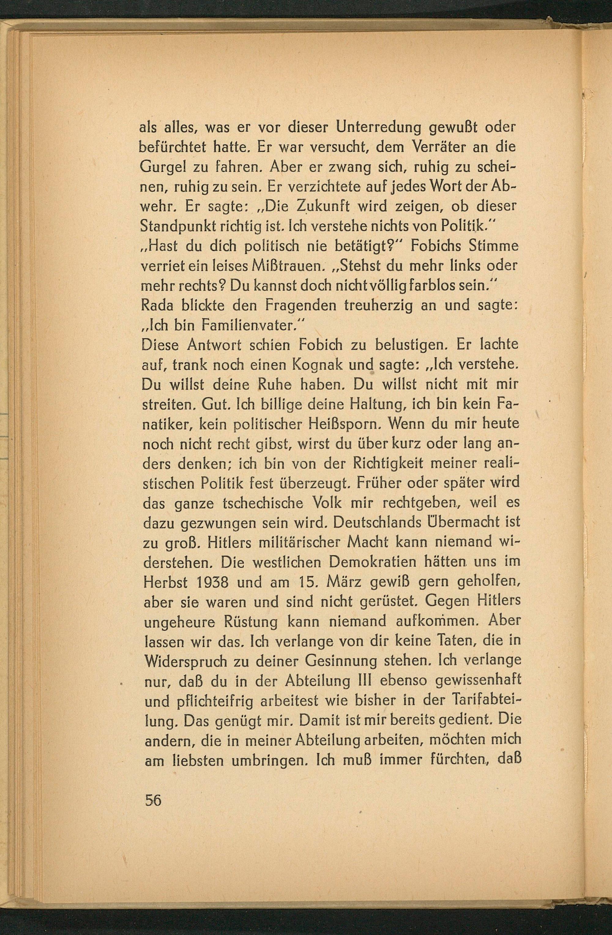 Diese Antwort schien Fobich zu belustigen. Er lachte auf, trank noch einen Kognak und sagte: ,, Ich verstehe. Du willst deine Ruhe haben. Du willst nicht mit mir streiten. Gut. Ich billige deine Haltung, ich bin kein Fanatiker, kein politischer Heißsporn. Wenn du mir heute noch nicht recht gibst, wirst du über kurz oder lang anders denken; ich bin von der Richtigkeit meiner realistischen Politik fest überzeugt. Früher oder später wird das ganze tschechische Volk mir rechtgeben, weil es dazu gezwungen sein wird. Deutschlands Übermacht ist zu groß. Hitlers militärischer Macht kann niemand widerstehen. Die westlichen Demokratien hätten uns im Herbst 1938 und am 15. März gewiß gern geholfen, aber sie waren und sind nicht gerüstet. Gegen Hitlers ungeheure Rüstung kann niemand aufkommen. Aber lassen wir das. Ich verlange von dir keine Taten, die in Widerspruch zu deiner Gesinnung stehen. Ich verlange nur, daß du in der Abteilung III ebenso gewissenhaft und pflichteifrig arbeitest wie bisher in der Tarifabteilung. Das genügt mir. Damit ist mir bereits gedient. Die andern, die in meiner Abteilung arbeiten, möchten mich am liebsten umbringen. Ich muß immer fürchten, daß