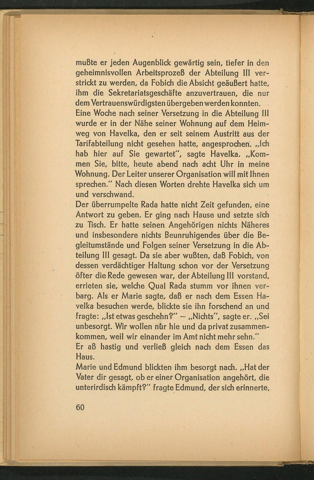 mußte er jeden Augenblick gewärtig sein, tiefer in den geheimnisvollen Arbeitsprozeß der Abteilung III ver- strickt zu werden, da Fobich die Absicht geäußert hatte, ihm die Sekretariatsgeschäfte anzuvertrauen, die nur dem Vertrauenswürdigsten übergeben werdenkonnten. Eine Woche nach seiner Versetzung in die Abteilung Ill wurde er in der Nähe seiner Wohnung auf dem Heim- weg von Havelka, den er seit seinem Austritt aus der Tarifabteilung nicht gesehen hatte, angesprochen.„Ich hab hier auf Sie gewartet”, sagte Havelka.„Kom- men Sie, bitte, heute abend nach acht Uhr in meine Wohnung. Der Leiter unserer Organisation will mit Ihnen sprechen.‘ Nach diesen Worten drehte Havelka sich um und verschwand.