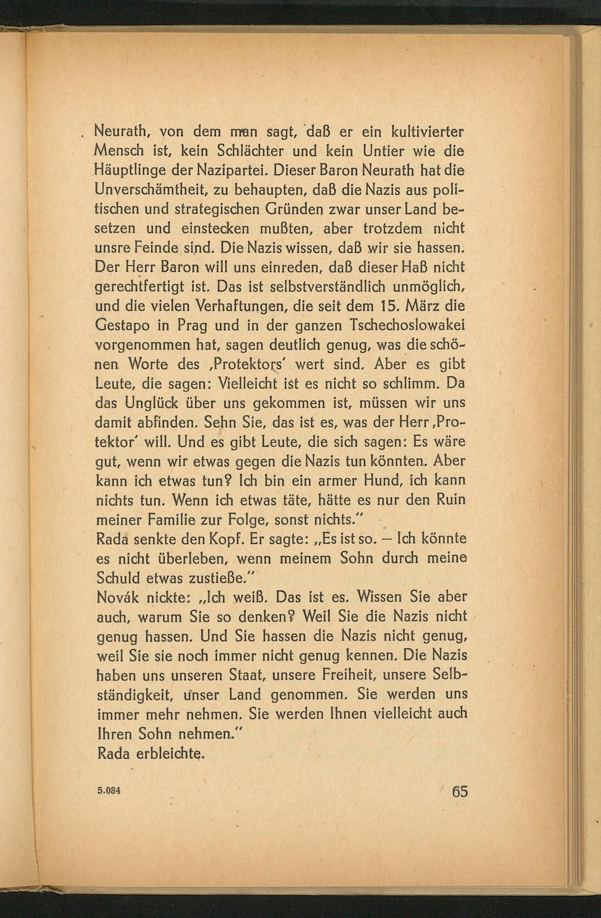 Novák nickte: ,, Ich weiß. Das ist es. Wissen Sie aber auch, warum Sie so denken? Weil Sie die Nazis nicht genug hassen. Und Sie hassen die Nazis nicht genug, weil Sie sie noch immer nicht genug kennen. Die Nazis haben uns unseren Staat, unsere Freiheit, unsere Selbständigkeit, unser Land genommen. Sie werden uns immer mehr nehmen. Sie werden Ihnen vielleicht auch Ihren Sohn nehmen.'