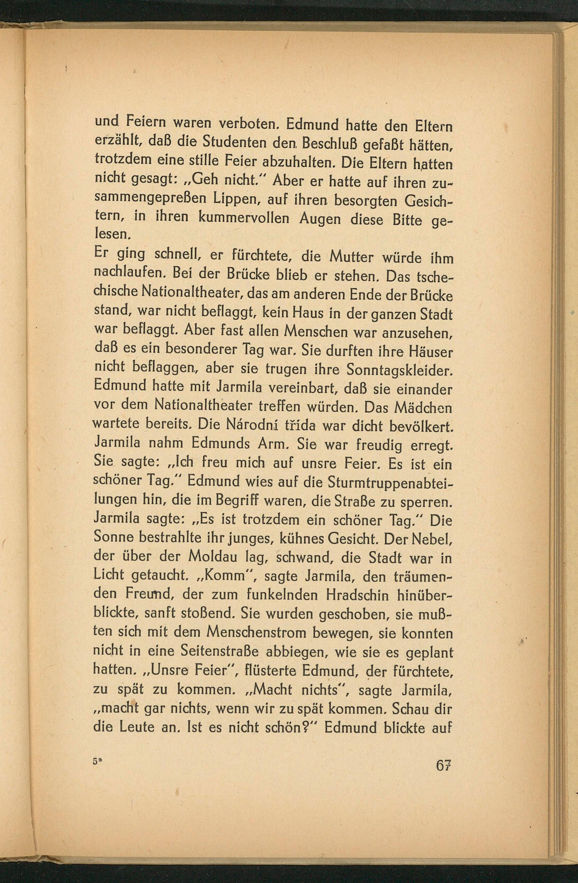 Er ging schnell, er fürchtete, die Mutter würde ihm nachlaufen. Bei der Brücke blieb er stehen. Das tsche- chische Nationaltheater, das am anderen Ende der Brücke stand, war nicht beflaggt, kein Haus in der ganzen Stadt war beflaggt. Aber fast allen Menschen war anzusehen, daß es ein besonderer Tag war. Sie durften ihre Häuser nicht beflaggen, aber sie trugen ihre Sonntagskleider. Edmund hatte mit Jarmila vereinbart, daß sie einander vor dem Nationaltheater treffen würden. Das Mädchen wartete bereits. Die Närodni tfida war dicht bevölkert. Jarmila nahm Edmunds Arm. Sie war freudig erregt. Sie sagte:„Ich freu mich auf unsre Feier. Es ist ein schöner Tag.‘ Edmund wies auf die Sturmtruppenabtei- lungen hin, die im Begriff waren, die Straße zu sperren. Jarmila sagte:„Es ist trotzdem ein schöner Tag.” Die Sonne bestrahlte ihr junges, kühnes Gesicht. Der Nebel, der über der Moldau lag, schwand, die Stadt war in Licht getaucht.„Komm“, sagte Jarmila, den träumen- den Freund, der zum funkelnden Hradschin hinüber- blickte, sanft stoßend. Sie wurden geschoben, sie muß- ten sich mit dem Menschenstrom bewegen, sie konnten nicht in eine Seitenstraße abbiegen, wie sie es geplant hatten.„Unsre Feier“, flüsterte Edmund, der fürchtete, zu spät zu kommen.„Macht nichts“, sagte Jarmila, „macht gar nichts, wenn wir zu spät kommen. Schau dir die Leute an. Ist es nicht schön?‘ Edmund blickte auf
