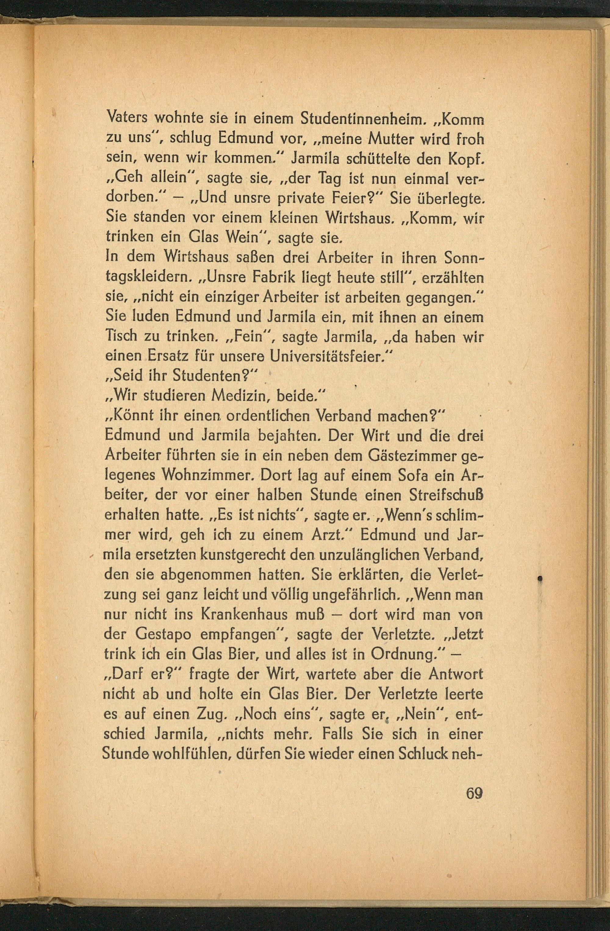 ,, Könnt ihr einen ordentlichen Verband machen?" Edmund und Jarmila bejahten. Der Wirt und die drei Arbeiter führten sie in ein neben dem Gästezimmer gelegenes Wohnzimmer. Dort lag auf einem Sofa ein Arbeiter, der vor einer halben Stunde einen Streifschuß erhalten hatte. ,, Es ist nichts", sagte er. ,, Wenn's schlimmer wird, geh ich zu einem Arzt." Edmund und Jarmila ersetzten kunstgerecht den unzulänglichen Verband, den sie abgenommen hatten. Sie erklärten, die Verletzung sei ganz leicht und völlig ungefährlich. ,, Wenn man nur nicht ins Krankenhaus muß dort wird man von der Gestapo empfangen", sagte der Verletzte. ,, Jetzt trink ich ein Glas Bier, und alles ist in Ordnung." ,, Darf er?" fragte der Wirt, wartete aber die Antwort nicht ab und holte ein Glas Bier. Der Verletzte leerte es auf einen Zug. ,, Noch eins", sagte er ,,, Nein", entschied Jarmila ,,, nichts mehr. Falls Sie sich in einer Stunde wohlfühlen, dürfen Sie wieder einen Schluck neh