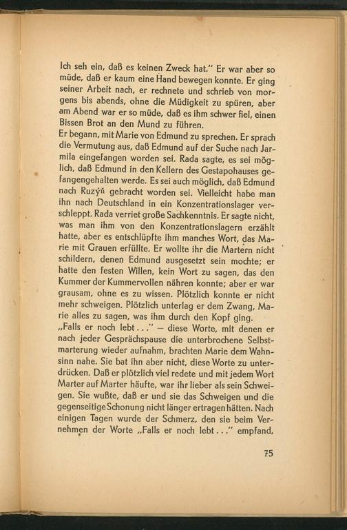 Er begann, mit Marie von Edmund zu sprechen. Er sprach die Vermutung aus, daß Edmund auf der Suche nach Jarmila eingefangen worden sei. Rada sagte, es sei möglich, daß Edmund in den Kellern des Gestapohauses gefangengehalten werde. Es sei auch möglich, daß Edmund nach Ruzýň gebracht worden sei. Vielleicht habe man ihn nach Deutschland in ein Konzentrationslager verschleppt. Rada verriet große Sachkenntnis. Er sagte nicht, was man ihm von den Konzentrationslagern erzählt hatte, aber es entschlüpfte ihm manches Wort, das Marie mit Grauen erfüllte. Er wollte ihr die Martern nicht schildern, denen Edmund ausgesetzt sein mochte; er hatte den festen Willen, kein Wort zu sagen, das den Kummer der Kummervollen nähren konnte; aber er war grausam, ohne es zu wissen. Plötzlich konnte er nicht mehr schweigen. Plötzlich unterlag er dem Zwang, Marie alles zu sagen, was ihm durch den Kopf ging. ,, Falls er noch lebt..."- diese Worte, mit denen er nach jeder Gesprächspause die unterbrochene Selbstmarterung wieder aufnahm, brachten Marie dem Wahnsinn nahe. Sie bat ihn aber nicht, diese Worte zu unterdrücken. Daß er plötzlich viel redete und mit jedem Wort Marter auf Marter häufte, war ihr lieber als sein Schweigen. Sie wußte, daß er und sie das Schweigen und die gegenseitige Schonung nicht länger ertragen hätten. Nach einigen Tagen wurde der Schmerz, den sie beim Vernehmen der Worte ,, Falls er noch lebt..." empfand,