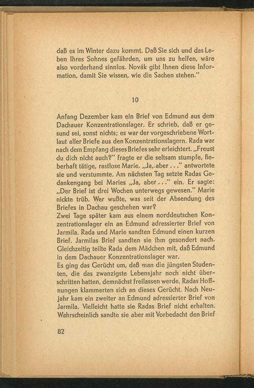 Zwei Tage später kam aus einem norddeutschen Konzentrationslager ein an Edmund adressierter Brief von Jarmila. Rada und Marie sandten Edmund einen kurzen Brief. Jarmilas Brief sandten sie ihm gesondert nach. Gleichzeitig teilte Rada dem Mädchen mit, daß Edmund in dem Dachauer Konzentrationslager war.