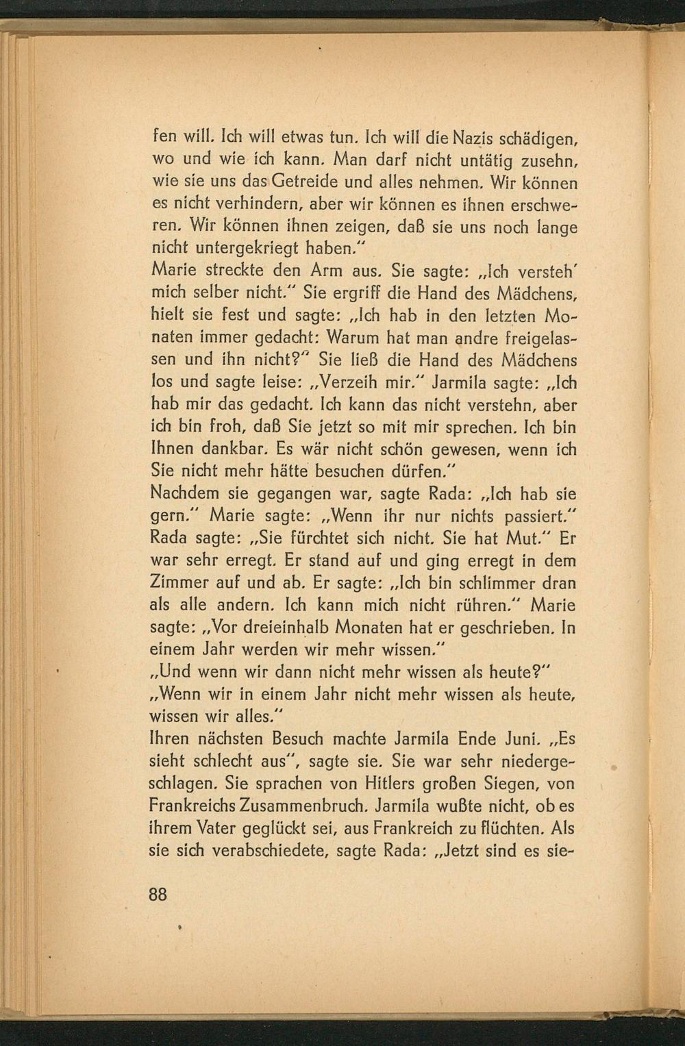 Ihren nächsten Besuch machte Jarmila Ende Juni. ,, Es sieht schlecht aus", sagte sie. Sie war sehr niedergeschlagen. Sie sprachen von Hitlers großen Siegen, von Frankreichs Zusammenbruch. Jarmila wußte nicht, ob es ihrem Vater geglückt sei, aus Frankreich zu flüchten. Als sie sich verabschiedete, sagte Rada: ,, Jetzt sind es sie