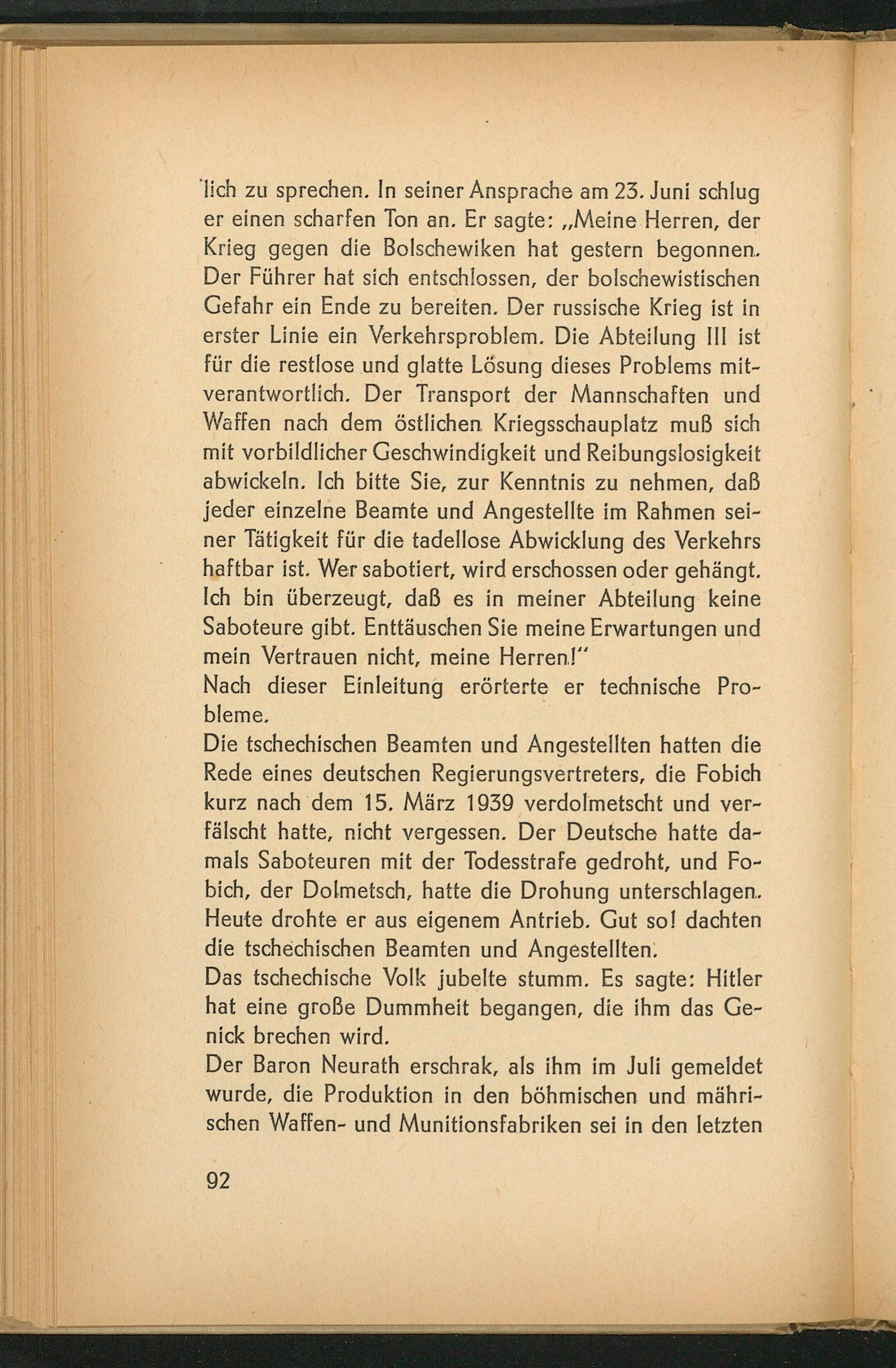 Die tschechischen Beamten und Angestellten hatten die Rede eines deutschen Regierungsvertreters, die Fobich kurz nach dem 15. März 1939 verdolmetscht und verfälscht hatte, nicht vergessen. Der Deutsche hatte damals Saboteuren mit der Todesstrafe gedroht, und Fobich, der Dolmetsch , hatte die Drohung unterschlagen. Heute drohte er aus eigenem Antrieb. Gut so! dachten die tschechischen Beamten und Angestellten.