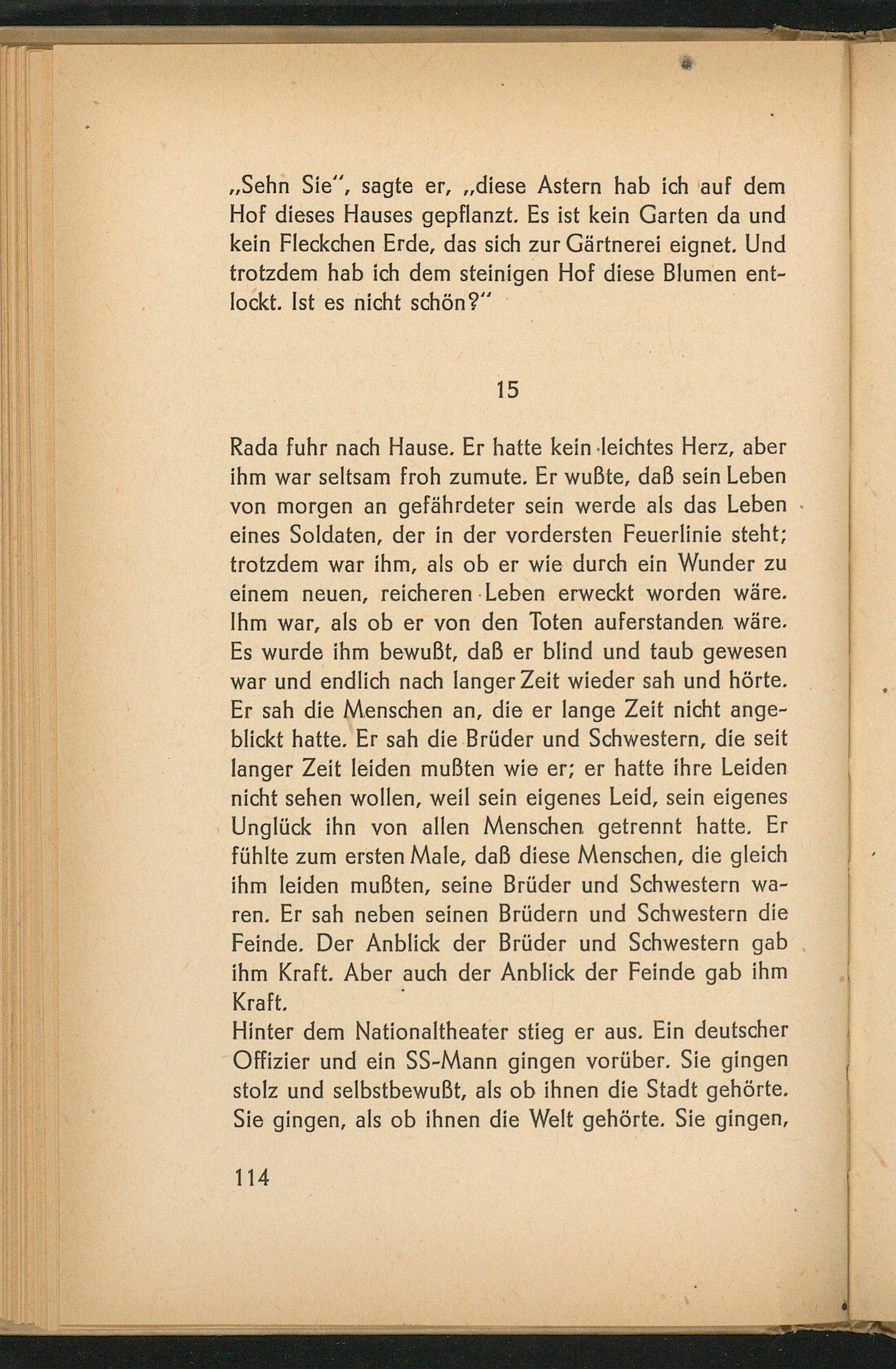 Hinter dem Nationaltheater stieg er aus. Ein deutscher Offizier und ein SS- Mann gingen vorüber. Sie gingen stolz und selbstbewußt, als ob ihnen die Stadt gehörte. Sie gingen, als ob ihnen die Welt gehörte. Sie gingen,