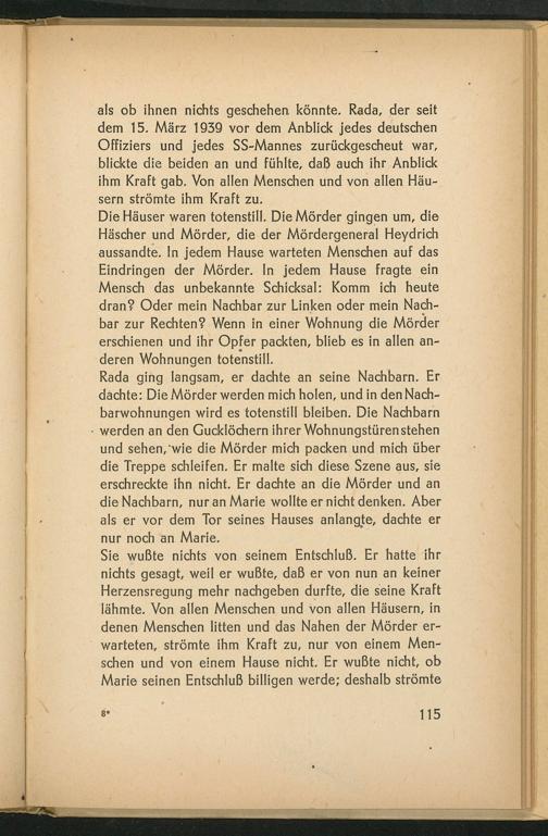 Die Häuser waren totenstill. Die Mörder gingen um, die Häscher und Mörder, die der Mördergeneral Heydrich aussandte. In jedem Hause warteten Menschen auf das Eindringen der Mörder. In jedem Hause fragte ein Mensch das unbekannte Schicksal: Komm ich heute dran? Oder mein Nachbar zur Linken oder mein Nachbar zur Rechten? Wenn in einer Wohnung die Mörder erschienen und ihr Opfer packten, blieb es in allen anderen Wohnungen totenstill.