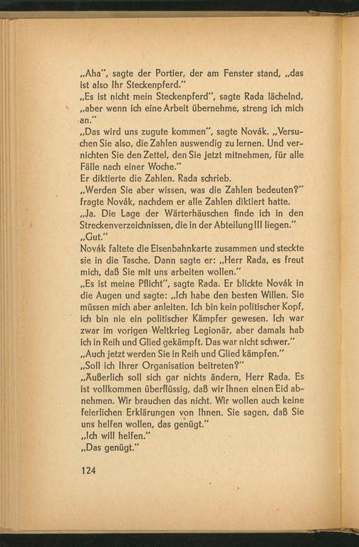„Es ist meine Pflicht”, sagte Rada. Er blickte Novak in die Augen und sagte:„Ich habe den besten Willen. Sie müssen mich aber anleiten. Ich bin kein politischer Kopf, ich bin nie ein politischer Kämpfer gewesen. Ich war zwar im vorigen Weltkrieg Legionär, aber damals hab ich in Reih und Glied gekämpft. Das war nicht schwer.” „Auch jetzt werden Sie in Reih und Glied kämpfen.“ „Soll ich Ihrer Organisation beitreten?”