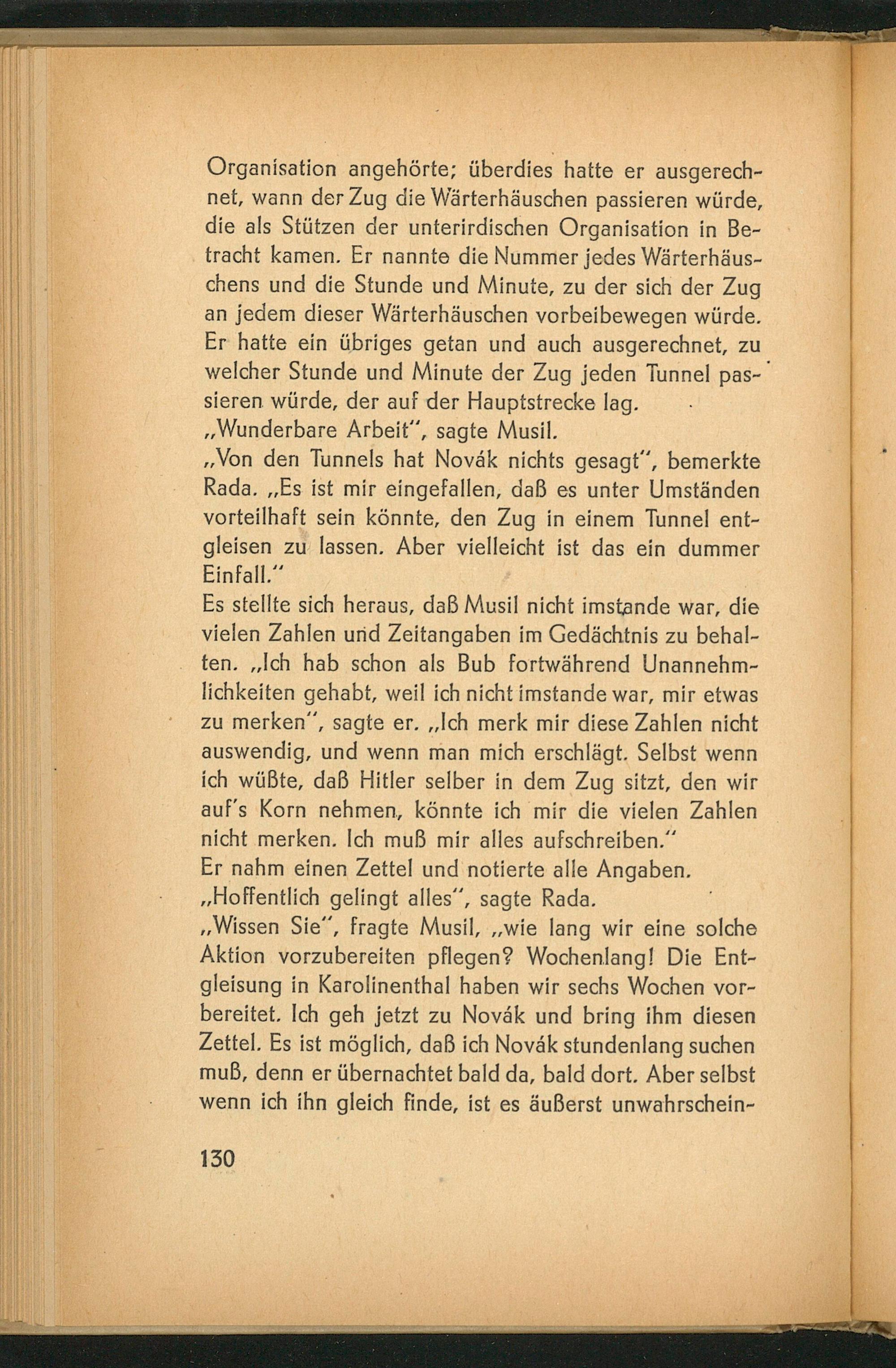 Es stellte sich heraus, daß Musil nicht imstande war, die vielen Zahlen und Zeitangaben im Gedächtnis zu behal- ten.„Ich hab schon als Bub fortwährend Unannehm- lichkeiten gehabt, weil ich nicht imstande war, mir etwas zu merken”, sagte er.„Ich merk mir diese Zahlen nicht auswendig, und wenn man mich erschlägt. Selbst wenn ich wüßte, daß Hitler selber in dem Zug sitzt, den wir auf's Korn nehmen, könnte ich mir die vielen Zahlen nicht merken. Ich muß mir alles aufschreiben.“