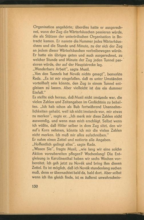 Organisation angehörte; überdies hatte er ausgerech- net, wann der Zug die Wärterhäuschen passieren würde, die als Stützen der unterirdischen Organisation in Be- tracht kamen. Er nannte die Nummer jedes Wärterhäus- chens und die Stunde und Minute, zu der sich der Zug an jedem dieser Wärterhäuschen vorbeibewegen würde. Er hatte ein übriges getan und auch ausgerechnet, zu welcher Stunde und Minute der Zug jeden Tunnel pas- sieren würde, der auf der Hauptstrecke lag. ‚Wunderbare Arbeit‘, sagte Musil.