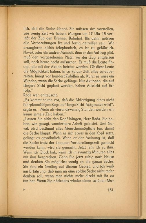 arrangieren nichts telephonisch, es ist zu gefährlich. Novak oder ein andrer Mensch, dem er den Auftrag gibt, muß den vorgesehenen Platz, wo der Zug entgleisen soll, noch heute nacht aufsuchen. Er muß die Leute fin- den, die mit der Aktion betraut werden. Ob diese Leute die Möglichkeit haben, in so kurzer Zeit alles vorzube- reiten, hängt von hundert Zufällen ab. Kurz, es wäre ein Wunder, wenn die Sache gelänge. Nur Aktionen, die auf längere Sicht geplant werden, haben Aussicht auf Er- folg.“
