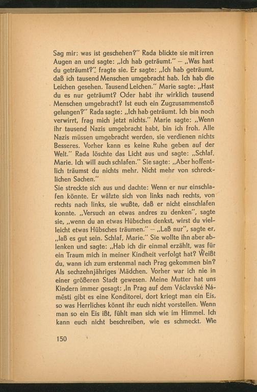 Sie streckte sich aus und dachte: Wenn er nur einschlafen könnte. Er wälzte sich von links nach rechts, von rechts nach links, sie wußte, daß er nicht einschlafen konnte. ,, Versuch an etwas andres zu denken", sagte sie ,,, wenn du an etwas Hübsches denkst, wirst du vielleicht etwas Hübsches träumen."- ,, Laß nur", sagte er, ,, laß es gut sein. Schlaf, Marie." Sie wollte ihn aber ablenken und sagte: ,, Hab ich dir einmal erzählt, was für ein Traum mich in meiner Kindheit verfolgt hat? Weißt du, wann ich zum erstenmal nach Prag gekommen bin? Als sechzehnjähriges Mädchen. Vorher war ich nie in einer größeren Stadt gewesen. Meine Mutter hat uns Kindern immer gesagt: In Prag auf dem Václavské Náměstí gibt es eine Konditorei, dort kriegt man ein Eis, so was Herrliches könnt ihr euch nicht vorstellen. Wenn man so ein Eis ißt, fühlt man sich wie im Himmel. Ich kann euch nicht beschreiben, wie es schmeckt. Wie