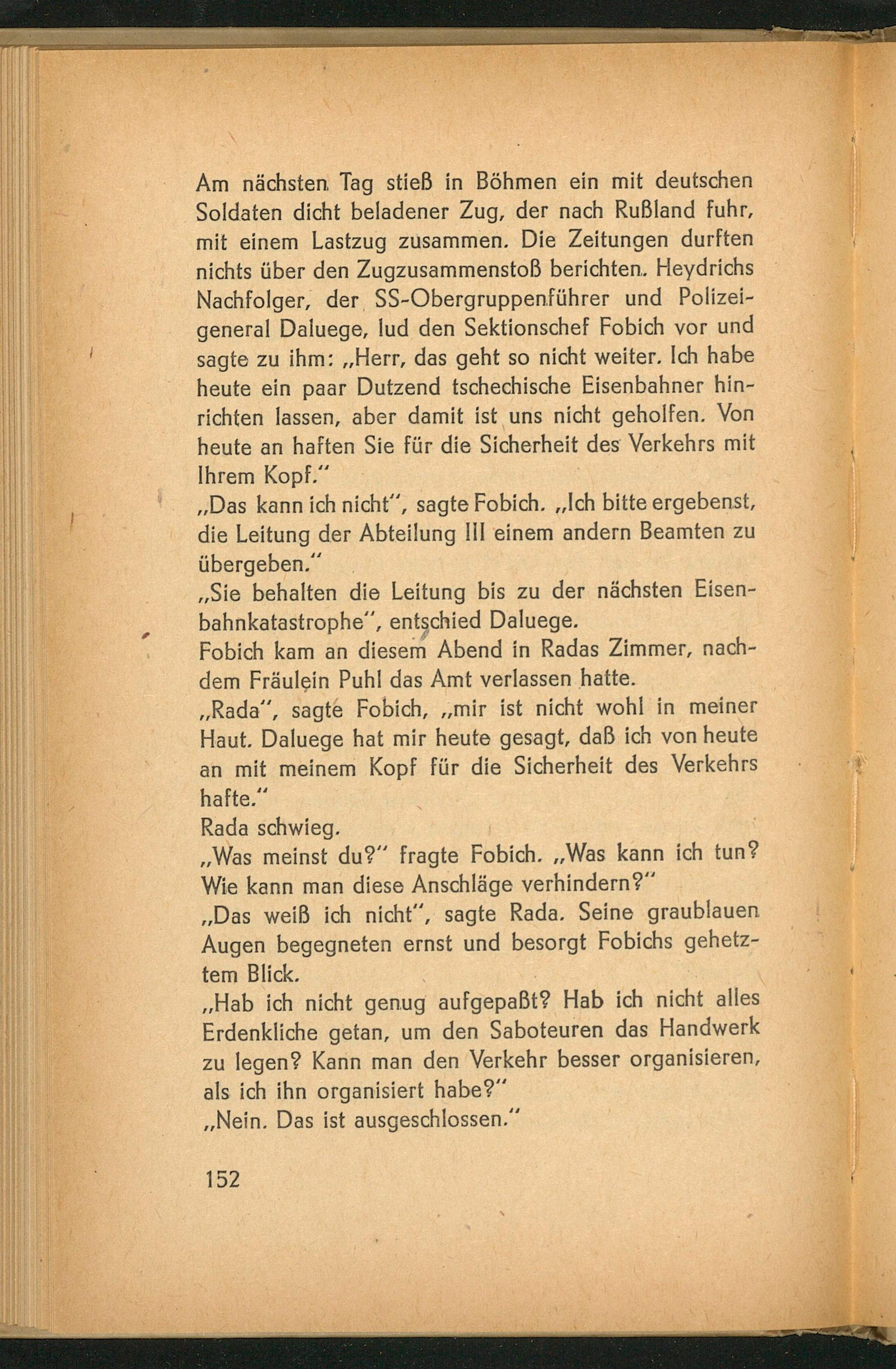 Am nächsten Tag stieß in Böhmen ein mit deutschen Soldaten dicht beladener Zug, der nach Rußland fuhr, mit einem Lastzug zusammen. Die Zeitungen durften nichts über den Zugzusammenstoß berichten. Heydrichs Nachfolger, der SS- Obergruppenführer und Polizeigeneral Daluege , lud den Sektionschef Fobich vor und sagte zu ihm: ,, Herr, das geht so nicht weiter. Ich habe heute ein paar Dutzend tschechische Eisenbahner hinrichten lassen, aber damit ist uns nicht geholfen. Von heute an haften Sie für die Sicherheit des Verkehrs mit Ihrem Kopf."