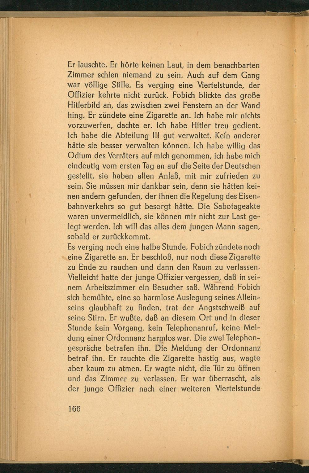 Er lauschte. Er hörte keinen Laut, in dem benachbarten Zimmer schien niemand zu sein. Auch auf dem Gang war völlige Stille. Es verging eine Viertelstunde, der Offizier kehrte nicht zurück. Fobich blickte das große ‚Hitlerbild an, das zwischen zwei Fenstern an der Wand hing. Er zündete eine Zigarette an. Ich habe mir nichts vorzuwerfen, dachte er. Ich habe Hitler treu gedient. Ich habe die Abteilung IN gut verwaltet. Kein anderer hätte sie besser verwalten können. Ich habe willig das Odium des Verräters auf mich genommen, ich habe mich eindeutig vom ersten Tag an auf die Seite der Deutschen gestellt, sie haben allen Anlaß, mit mir zufrieden zu sein. Sie müssen mir dankbar sein, denn sie hätten kei- nen andern gefunden, der ihnen die Regelung des Eisen- bahnverkehrs so gut besorgt hätte. Die Sabotageakte waren unvermeidlich, sie können mir nicht zur Last ge- legt werden. Ich will das alles dem jungen Mann sagen, sobald er zurückkommt.