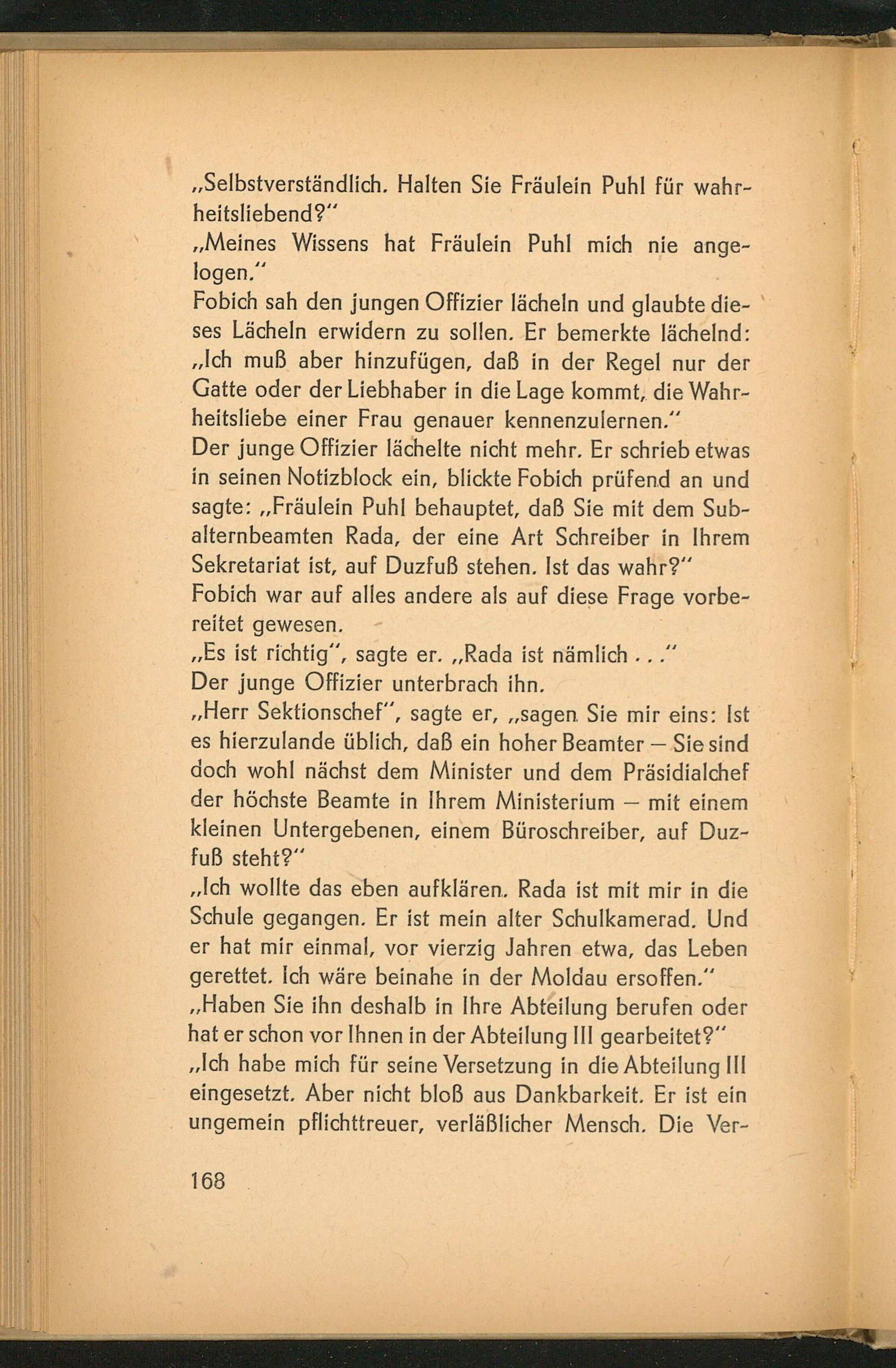 Der junge Offizier lächelte nicht mehr. Er schrieb etwas in seinen Notizblock ein, blickte Fobich prüfend an und sagte:„Fräulein Puhl behauptet, daß Sie mit dem Sub- alternbeamten Rada, der eine Art Schreiber in Ihrem Sekretariat ist, auf Duzfuß stehen. Ist das wahr?” Fobich war auf alles andere als auf diese Frage vorbe- reitet gewesen.