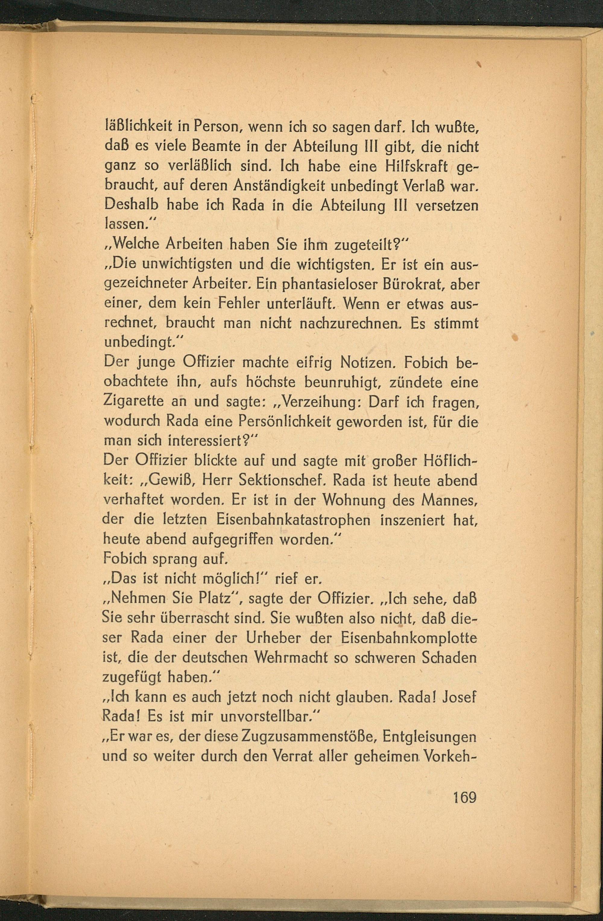 Der Offizier blickte auf und sagte mit großer Höflichkeit: ,, Gewiß, Herr Sektionschef. Rada ist heute abend verhaftet worden. Er ist in der Wohnung des Mannes, der die letzten Eisenbahnkatastrophen inszeniert hat, heute abend aufgegriffen worden."