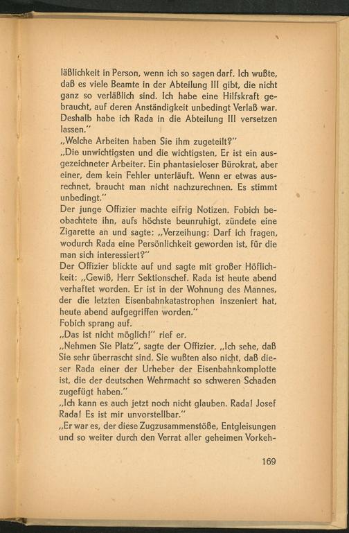 Der junge Offizier machte eifrig Notizen. Fobich beobachtete ihn, aufs höchste beunruhigt, zündete eine Zigarette an und sagte: ,, Verzeihung: Darf ich fragen, wodurch Rada eine Persönlichkeit geworden ist, für die man sich interessiert?"