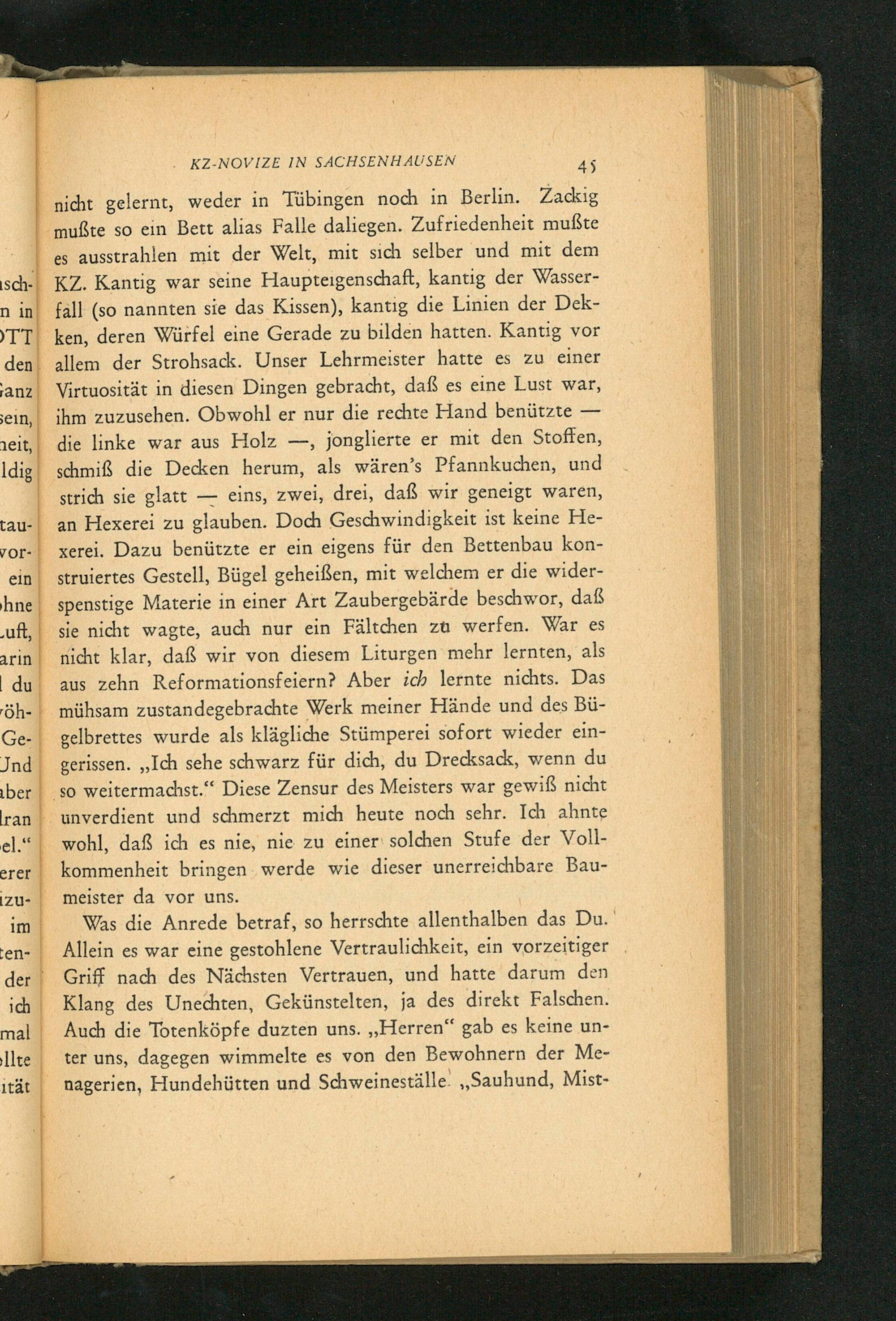 Was die Anrede betraf, so herrschte allenthalben das Du. Allein es war eine gestohlene Vertraulichkeit, ein vorzeitiger Griff nach des Nächsten Vertrauen, und hatte darum den Klang des Unechten, Gekünstelten, ja des direkt Falschen. Auch die Totenköpfe duzten uns. ,, Herren" gab es keine unter uns, dagegen wimmelte es von den Bewohnern der Menagerien, Hundehütten und Schweineställe. ,, Sauhund, Mist