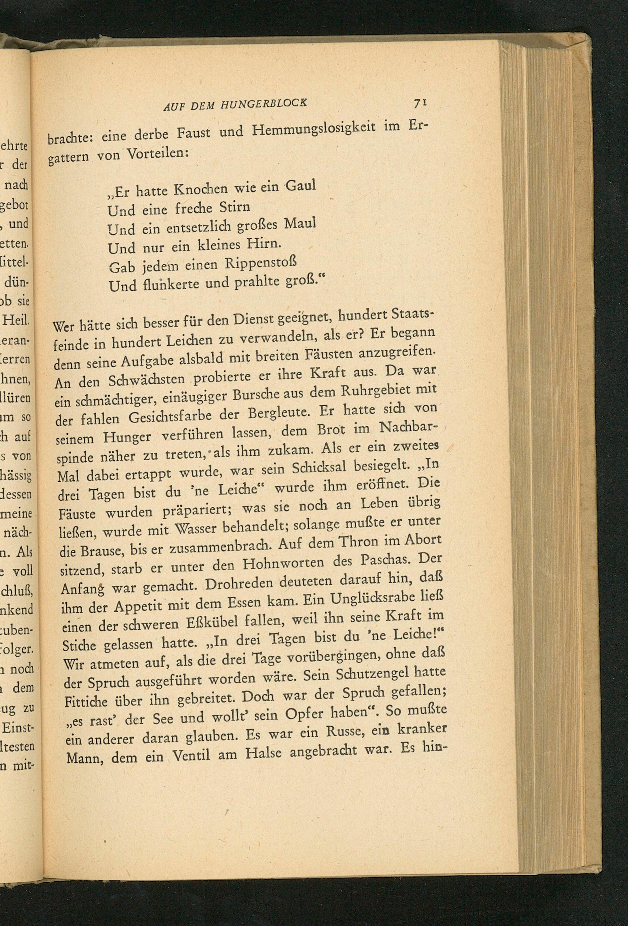 Wer hätte sich besser für den Dienst geeignet, hundert Staatsfeinde in hundert Leichen zu verwandeln, als er? Er begann denn seine Aufgabe alsbald mit breiten Fäusten anzugreifen. An den Schwächsten probierte er ihre Kraft aus. Da war ein schmächtiger, einäugiger Bursche aus dem Ruhrgebiet mit der fahlen Gesichtsfarbe der Bergleute. Er hatte sich von seinem Hunger verführen lassen, dem Brot im Nachbarspinde näher zu treten, als ihm zukam. Als er ein zweites Mal dabei ertappt wurde, war sein Schicksal besiegelt. ,, In drei Tagen bist du' ne Leiche" wurde ihm eröffnet. Die Fäuste wurden präpariert; was sie noch an Leben übrig ließen, wurde mit Wasser behandelt; solange mußte er unter die Brause, bis er zusammenbrach. Auf dem Thron im Abort sitzend, starb er unter den Hohnworten des Paschas. Der Anfang war gemacht. Drohreden deuteten darauf hin, daß ihm der Appetit mit dem Essen kam. Ein Unglücksrabe ließ einen der schweren Eẞkübel fallen, weil ihn seine Kraft im Stiche gelassen hatte. ,, In drei Tagen bist du' ne Leiche!" Wir atmeten auf, als die drei Tage vorübergingen, ohne daß der Spruch ausgeführt worden wäre. Sein Schutzengel hatte Fittiche über ihn gebreitet. Doch war der Spruch gefallen; ,, es rast' der See und wollt' sein Opfer haben". So mußte ein anderer daran glauben. Es war ein Russe, ein kranker Mann, dem ein Ventil am Halse angebracht war. Es hin