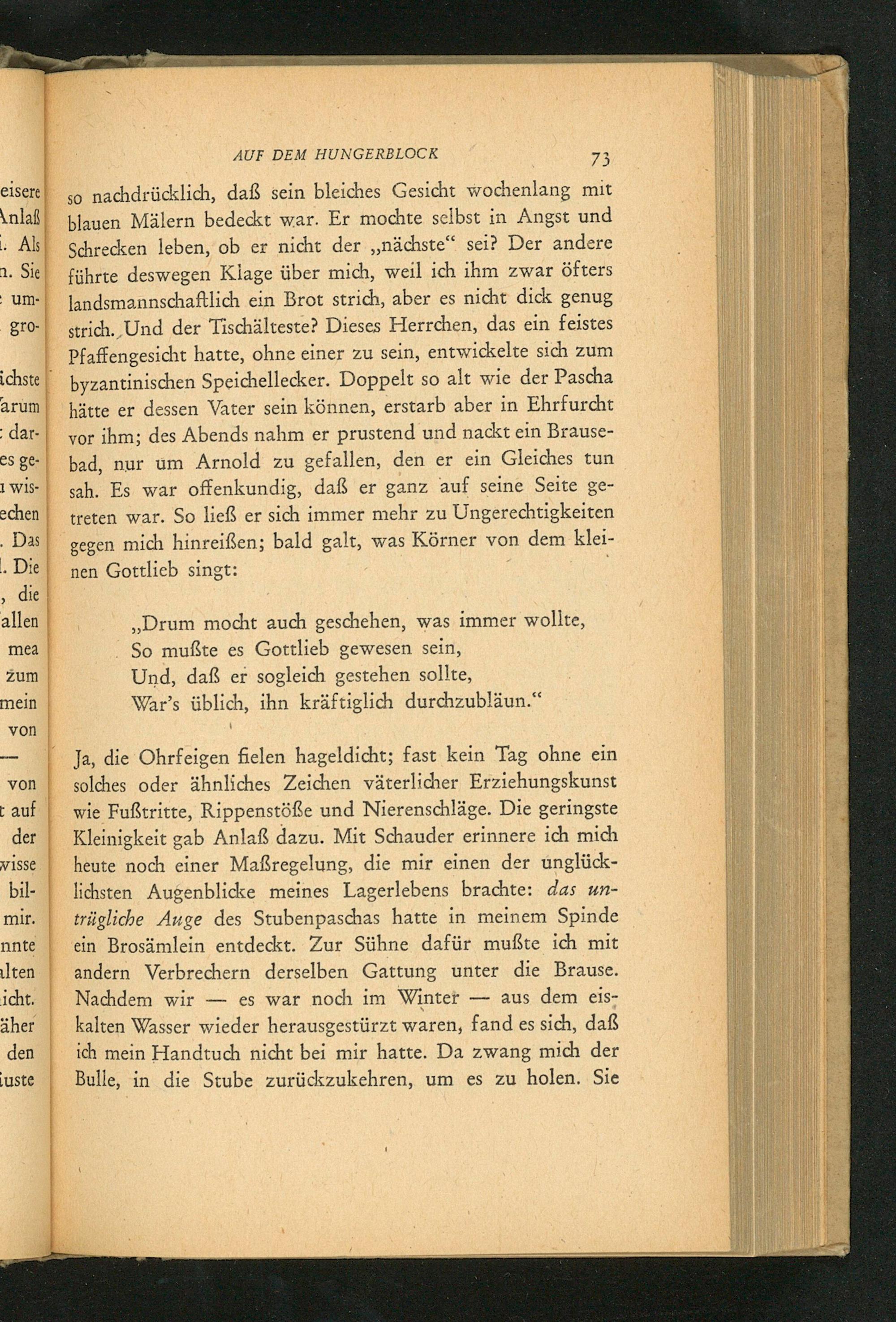 so nachdrücklich, daß sein bleiches Gesicht wochenlang mit blauen Mälern bedeckt war. Er mochte selbst in Angst und Schrecken leben, ob er nicht der„nächste“ sei? Der andere führte deswegen Klage über mich, weil ich ihm zwar öfters landsmannschaftlich ein Brot strich, aber es nicht dick genug strich.,.Und der Tischälteste? Dieses Herrchen, das ein feistes Pfaffengesicht hatte, ohne einer zu sein, entwickelte sich zum byzantinischen Speichellecker. Doppelt so alt wie der Pascha hätte er dessen Vater sein können, erstarb aber in Ehrfurcht vor ihm; des Abends nahm er prustend und nackt ein Brause- bad, nur um Arnold zu gefallen, den er ein Gleiches tun sah. Es war offenkundig, daß er ganz auf seine Seite ge- treten war. So ließ er sich immer mehr zu Ungerechtigkeiten gegen mich hinreißen; bald galt, was Körner von dem klei- nen Gottlieb singt: