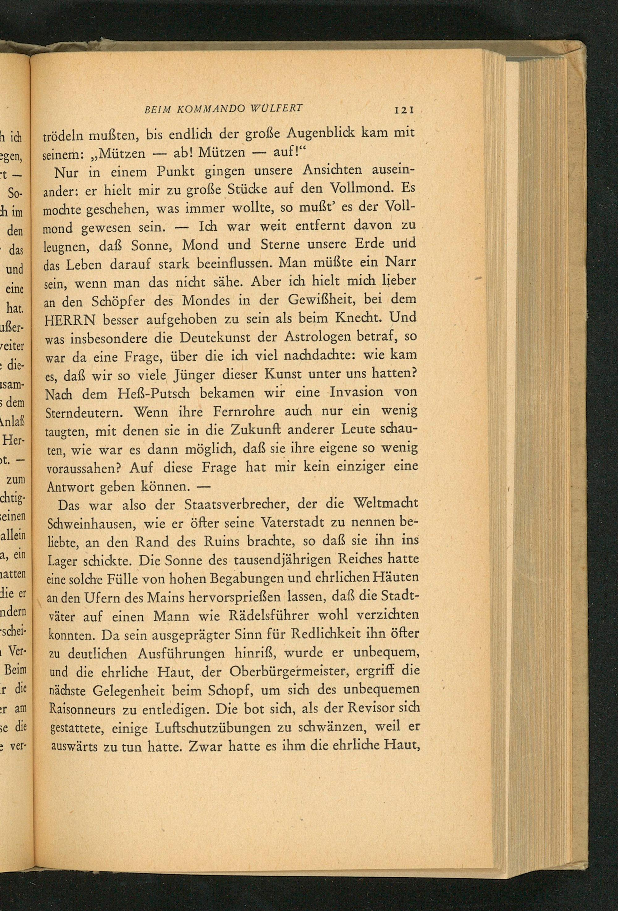 Nur in einem Punkt gingen unsere Ansichten auseinander: er hielt mir zu große Stücke auf den Vollmond. Es mochte geschehen, was immer wollte, so mußt' es der Vollmond gewesen sein. Ich war weit entfernt davon zu leugnen, daß Sonne, Mond und Sterne unsere Erde und das Leben darauf stark beeinflussen. Man müßte ein Narr sein, wenn man das nicht sähe. Aber ich hielt mich lieber an den Schöpfer des Mondes in der Gewißheit, bei dem HERRN besser aufgehoben zu sein als beim Knecht. Und was insbesondere die Deutekunst der Astrologen betraf, so war da eine Frage, über die ich viel nachdachte: wie kam es, daß wir so viele Jünger dieser Kunst unter uns hatten? Nach dem Heẞ- Putsch bekamen wir eine Invasion von Sterndeutern. Wenn ihre Fernrohre auch nur ein wenig taugten, mit denen sie in die Zukunft anderer Leute schauten, wie war es dann möglich, daß sie ihre eigene so wenig voraussahen? Auf diese Frage hat mir kein einziger eine Antwort geben können.-