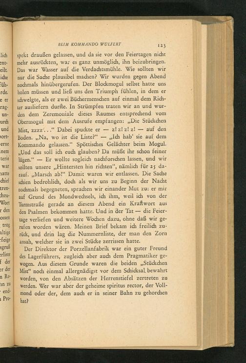 spekt draußen gelassen, und da sie vor den Feiertagen nicht mehr ausriickten, war es ganz unmöglich, ihn beizubringen. Das war Wasser auf die Verdachtsmühle. Wie sollten wir nur die Sache plausibel machen? Wir wurden gegen Abend nochmals hinübergerufen. Der Blockmogul selbst hatte uns holen müssen und ließ uns den Triumph fühlen, in dem er schwelgte, als er zwei Büchermenschen auf einmal dem Rich- ter ausliefern durfte. In Strümpfen traten wir an und wur- den dem Zeremoniale dieses Raumes entsprechend vom Obermogul mit dem Ausrufe empfangen:„Die Stückchen Mist, zzzz‘...“ Dabei spuckte er— z!z!z!z!— auf den Boden.„Na, wo ist die Liste?“—„Ich hab’ sie auf dem Kommando gelassen.“ Spöttisches Gelächter beim Mogul. „Und das soll ich euch glauben? Da müßt ihr schon feiner lügen.“— Er wollte sogleich nachforschen lassen, und wir sollten unsere„Hintersten hin richten“, nämlich für 25 da- rauf.„Marsch ab!“ Damit waren wir entlassen. Die Sache schien bedrohlich, doch als wir uns zu Beginn der Nacht nochmals begegneten, sprachen wir einander Mut zu: er mir auf Grund des Mondwechsels, ich ihm, weil ich von der Turmstraße gerade an diesem Abend ein Kraftwort aus den Psalmen bekommen hatte. Und in der Tat— die Feier- tage verliefen und weitere Wochen dazu, ohne daß wir ge- rufen worden wären. Meinen Brief bekam ich freilich zu- rück, und drin lag die Nummernliste, der man den Zorn ansah, welcher sie in zwei Stücke zerrissen hatte.