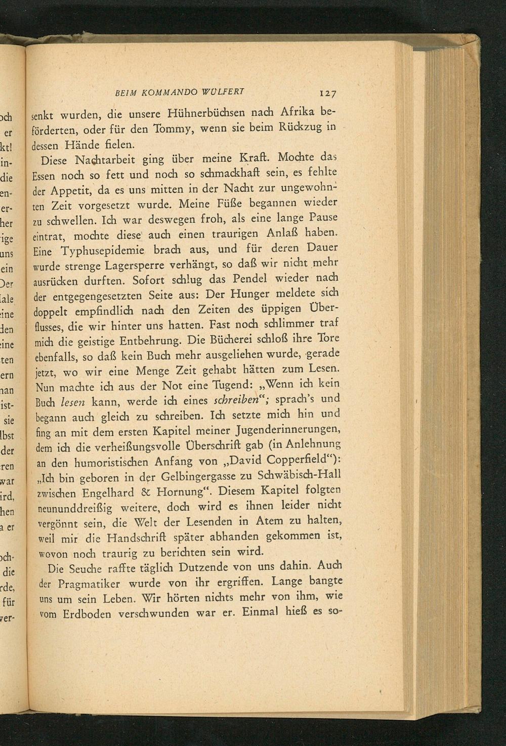 Buch lesen kann, werde ich eines schreiben“; sprach’s und Mi: be begann auch gleich zu schreiben. Ich setzte mich hin und| fing an mit dem ersten Kapitel meiner Jugenderinnerungen, dem ich die verheißungsvolle Überschrift gab(in Anlehnung an den humoristischen Anfang von„David Copperfield“): „Ich bin geboren in der Gelbingergasse zu Schwäbisch-Hall zwischen Engelhard& Hornung“. Diesem Kapitel folgten neununddreißig weitere, doch wird es ihnen leider nicht vergönnt sein, die Welt der Lesenden in Atem zu halten, weil mir die Handschrift später abhanden gekommen ist, wovon noch traurig zu berichten sein wird.