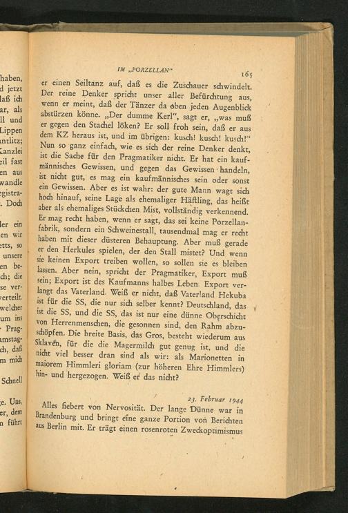 er einen Seiltanz auf, daß es die Zuschauer schwindelt. Der reine Denker spricht unser aller Befürchtung aus, wenn er meint, daß der Tänzer da oben jeden Augenblick abstürzen könne. ,, Der dumme Kerl", sagt er ,,, was muß er gegen den Stachel löken? Er soll froh sein, daß er aus dem KZ heraus ist, und im übrigen: kusch! kusch! kusch!" Nun so ganz einfach, wie es sich der reine Denker denkt, ist die Sache für den Pragmatiker nicht. Er hat ein kaufmännisches Gewissen, und gegen das Gewissen handeln, ist nicht gut, es mag ein kaufmännisches sein oder sonst ein Gewissen. Aber es ist wahr: der gute Mann wagt sich hoch hinauf, seine Lage als ehemaliger Häftling, das heißt aber als ehemaliges Stückchen Mist, vollständig verkennend. Er mag recht haben, wenn er sagt, das sei keine Porzellanfabrik, sondern ein Schweinestall, tausendmal mag er recht haben mit dieser düsteren Behauptung. Aber muß gerade er den Herkules spielen, der den Stall mistet? Und wenn sie keinen Export treiben wollen, so sollen sie es bleiben lassen. Aber nein, spricht der Pragmatiker, Export muẞ sein; Export ist des Kaufmanns halbes Leben. Export verlangt das Vaterland. Weiß er nicht, daß Vaterland Hekuba ist für die SS, die nur sich selber kennt? Deutschland , das ist die SS, und die SS, das ist nur eine dünne Oberschicht von Herrenmenschen, die gesonnen sind, den Rahm abzuschöpfen. Die breite Basis, das Gros, besteht wiederum aus Sklaven, für die die Magermilch gut genug ist, und die nicht viel besser dran sind als wir: als Marionetten in maiorem Himmleri gloriam( zur höheren Ehre Himmlers) hin- und hergezogen. Weiß er das nicht?