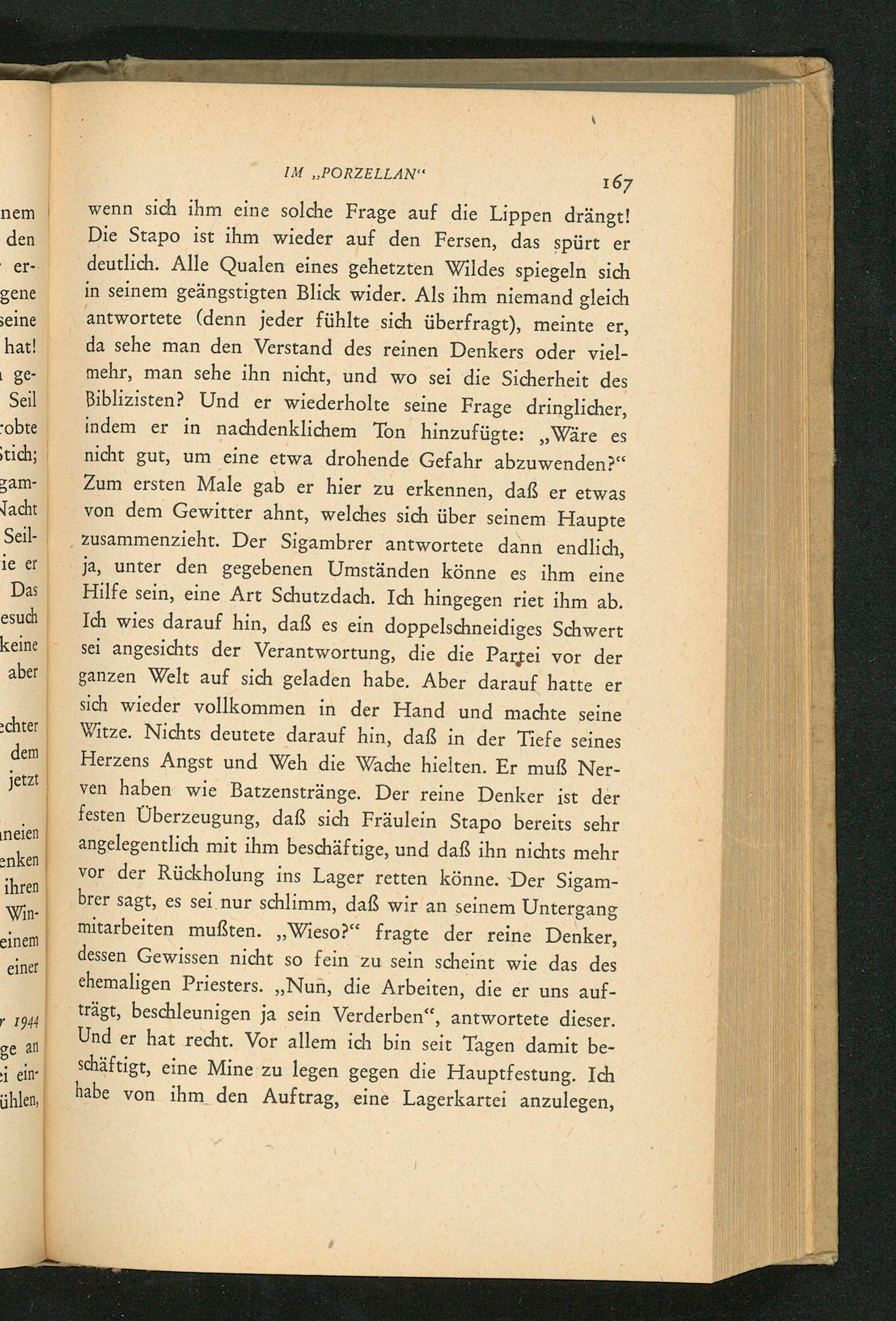 wenn sich ihm eine solche Frage auf die Lippen drängt! Die Stapo ist ihm wieder auf den Fersen, das spürt er deutlich. Alle Qualen eines gehetzten Wildes spiegeln sich in seinem geängstigten Blick wider. Als ihm niemand gleich antwortete( denn jeder fühlte sich überfragt), meinte er, da sehe man den Verstand des reinen Denkers oder vielmehr, man sehe ihn nicht, und wo sei die Sicherheit des Biblizisten? Und er wiederholte seine Frage dringlicher, indem er in nachdenklichem Ton hinzufügte: ,, Wäre es nicht gut, um eine etwa drohende Gefahr abzuwenden?" Zum ersten Male gab er hier zu erkennen, daß er etwas von dem Gewitter ahnt, welches sich über seinem Haupte zusammenzieht. Der Sigambrer antwortete dann endlich, ja, unter den gegebenen Umständen könne es ihm eine Hilfe sein, eine Art Schutzdach. Ich hingegen riet ihm ab. Ich wies darauf hin, daß es ein doppelschneidiges Schwert sei angesichts der Verantwortung, die die Partei vor der ganzen Welt auf sich geladen habe. Aber darauf hatte er sich wieder vollkommen in der Hand und machte seine Witze. Nichts deutete darauf hin, daß in der Tiefe seines Herzens Angst und Weh die Wache hielten. Er muß Nerven haben wie Batzenstränge. Der reine Denker ist der festen Überzeugung, daß sich Fräulein Stapo bereits sehr angelegentlich mit ihm beschäftige, und daß ihn nichts mehr vor der Rückholung ins Lager retten könne. Der Sigambrer sagt, es sei nur schlimm, daß wir an seinem Untergang mitarbeiten mußten.„ Wieso?" fragte der reine Denker, dessen Gewissen nicht so fein zu sein scheint wie das des ehemaligen Priesters. ,, Nuñ, die Arbeiten, die er uns aufträgt, beschleunigen ja sein Verderben", antwortete dieser. Und er hat recht. Vor allem ich bin seit Tagen damit beschäftigt, eine Mine zu legen gegen die Hauptfestung. Ich habe von ihm den Auftrag, eine Lagerkartei anzulegen,