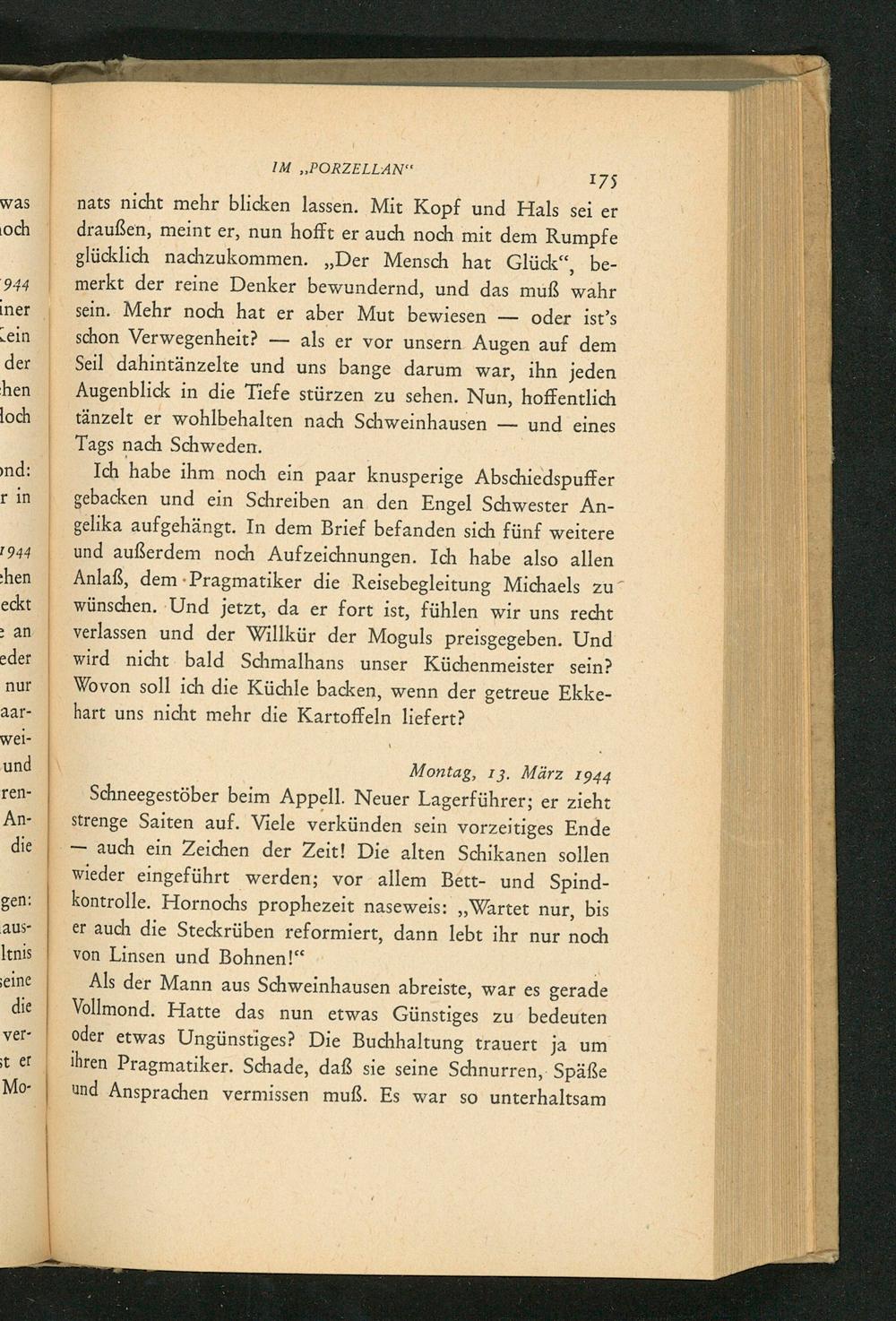 Montag, 13. März 1944 Schneegestöber beim Appell. Neuer Lagerführer; er zieht strenge Saiten auf. Viele verkünden sein vorzeitiges Ende auch ein Zeichen der Zeit! Die alten Schikanen sollen wieder eingeführt werden; vor allem Bett- und Spindkontrolle. Hornochs prophezeit naseweis: ,, Wartet nur, bis er auch die Steckrüben reformiert, dann lebt ihr nur noch von Linsen und Bohnen!"