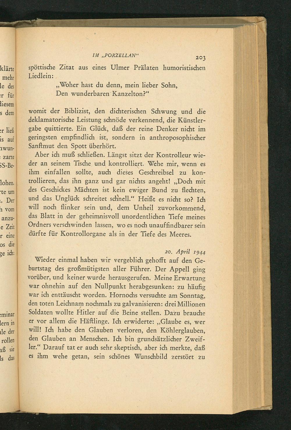 Wieder einmal haben wir vergeblich gehofft auf den Geburtstag des großmütigsten aller Führer. Der Appell ging vorüber, und keiner wurde herausgerufen. Meine Erwartung war ohnehin auf den Nullpunkt herabgesunken: zu häufig war ich enttäuscht worden. Hornochs versuchte am Sonntag, den toten Leichnam nochmals zu galvanisieren: drei Millionen Soldaten wollte Hitler auf die Beine stellen. Dazu brauche er vor allem die Häftlinge. Ich erwiderte: ,, Glaube es, wer will! Ich habe den Glauben verloren, den Köhlerglauben, den Glauben an Menschen. Ich bin grundsätzlicher Zweifler." Darauf tat er auch sehr skeptisch, aber ich merkte, daß es ihm wehe getan, sein schönes Wunschbild zerstört zu