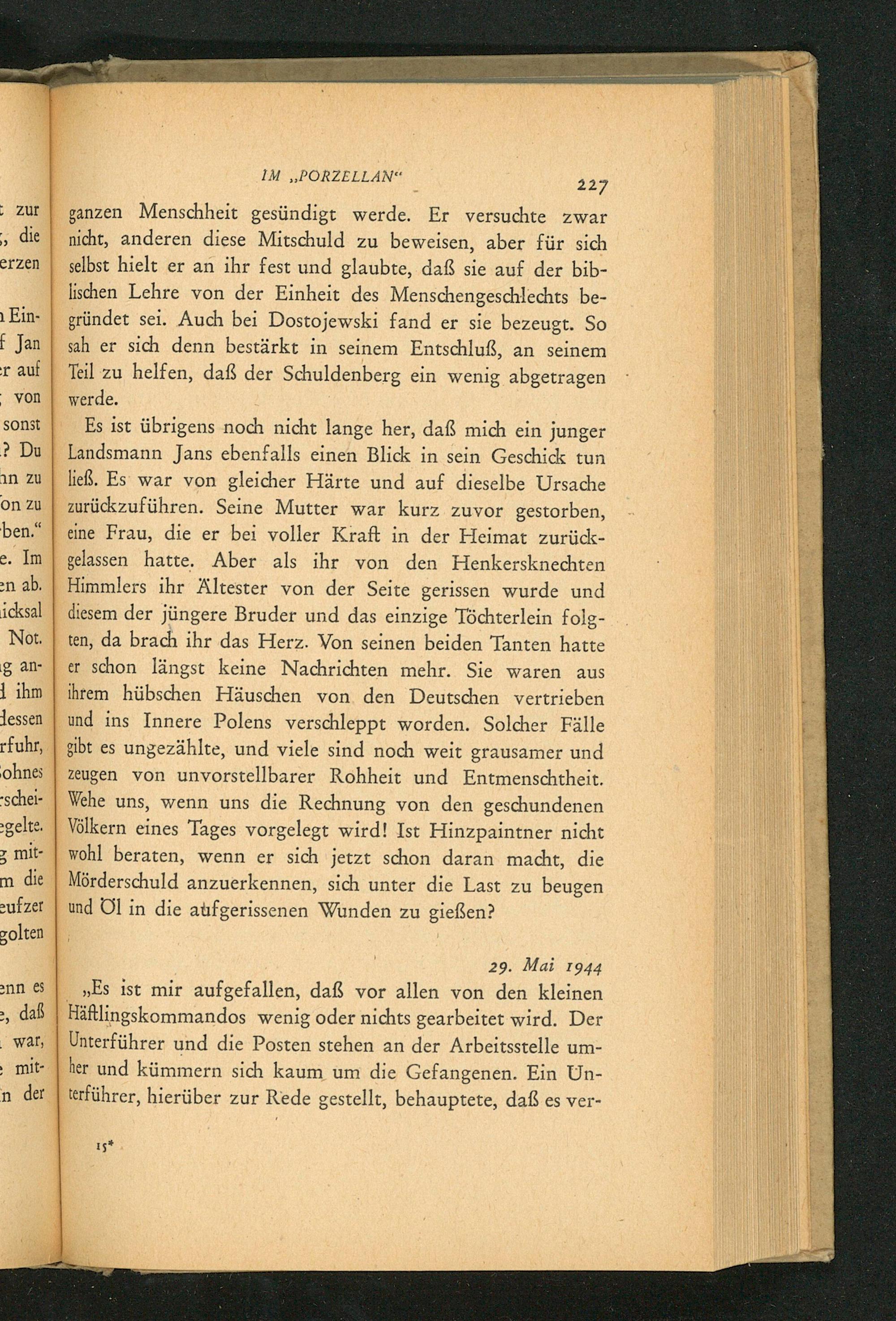 Es ist übrigens noch nicht lange her, daß mich ein junger Landsmann Jans ebenfalls einen Blick in sein Geschick tun ließ. Es war von gleicher Härte und auf dieselbe Ursache zurückzuführen. Seine Mutter war kurz zuvor gestorben, _ eine Frau, die er bei voller Kraft in der Heimat zurück- gelassen hatte. Aber als ihr von den Henkersknechten Himmlers ihr Ältester von der Seite gerissen wurde und diesem der jüngere Bruder und das einzige Töchterlein folg- ten, da brach ihr das Herz. Von seinen beiden Tanten hatte er schon längst keine Nachrichten mehr. Sie waren aus ihrem hübschen Häuschen von den Deutschen vertrieben und ins Innere Polens verschleppt worden. Solcher Fälle gibt es ungezählte, und viele sind noch weit grausamer und zeugen von unvorstellbarer Rohheit und Entmenschtheit. Wehe uns, wenn uns die Rechnung von den geschundenen Völkern eines Tages vorgelegt wird! Ist Hinzpaintner nicht wohl beraten, wenn er sich jetzt schon daran macht, die Mörderschuld anzuerkennen, sich unter die Last zu beugen und Ol in die aufgerissenen Wunden zu gießen?