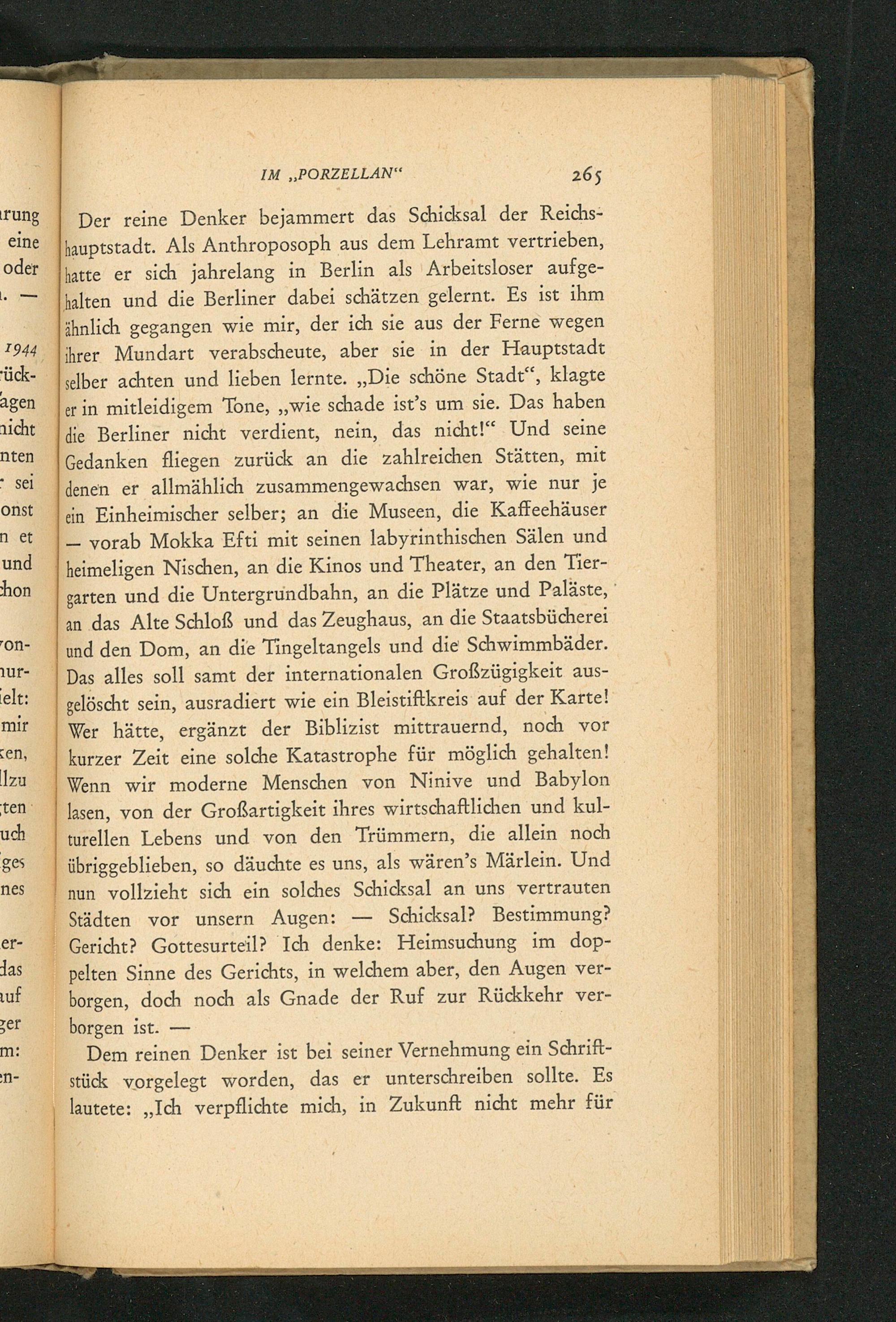 265 Der reine Denker bejammert das Schicksal der Reichshauptstadt. Als Anthroposoph aus dem Lehramt vertrieben, hatte er sich jahrelang in Berlin als Arbeitsloser aufgehalten und die Berliner dabei schätzen gelernt. Es ist ihm ähnlich gegangen wie mir, der ich sie aus der Ferne wegen ihrer Mundart verabscheute, aber sie in der Hauptstadt selber achten und lieben lernte. ,, Die schöne Stadt", klagte er in mitleidigem Tone ,,, wie schade ist's um sie. Das haben die Berliner nicht verdient, nein, das nicht!" Und seine Gedanken fliegen zurück an die zahlreichen Stätten, mit denen er allmählich zusammengewachsen war, wie nur je ein Einheimischer selber; an die Museen, die Kaffeehäuser vorab Mokka Efti mit seinen labyrinthischen Sälen und heimeligen Nischen, an die Kinos und Theater, an den Tiergarten und die Untergrundbahn, an die Plätze und Paläste, an das Alte Schloß und das Zeughaus, an die Staatsbücherei und den Dom, an die Tingeltangels und die Schwimmbäder. Das alles soll samt der internationalen Großzügigkeit ausgelöscht sein, ausradiert wie ein Bleistiftkreis auf der Karte! Wer hätte, ergänzt der Biblizist mittrauernd, noch vor kurzer Zeit eine solche Katastrophe für möglich gehalten! Wenn wir moderne Menschen von Ninive und Babylon lasen, von der Großartigkeit ihres wirtschaftlichen und kulturellen Lebens und von den Trümmern, die allein noch übriggeblieben, so däuchte es uns, als wären's Märlein. Und nun vollzieht sich ein solches Schicksal an uns vertrauten Städten vor unsern Augen: Schicksal? Bestimmung? Gericht? Gottesurteil? Ich denke: Heimsuchung im doppelten Sinne des Gerichts, in welchem aber, den Augen verborgen, doch noch als Gnade der Ruf zur Rückkehr verborgen ist.-