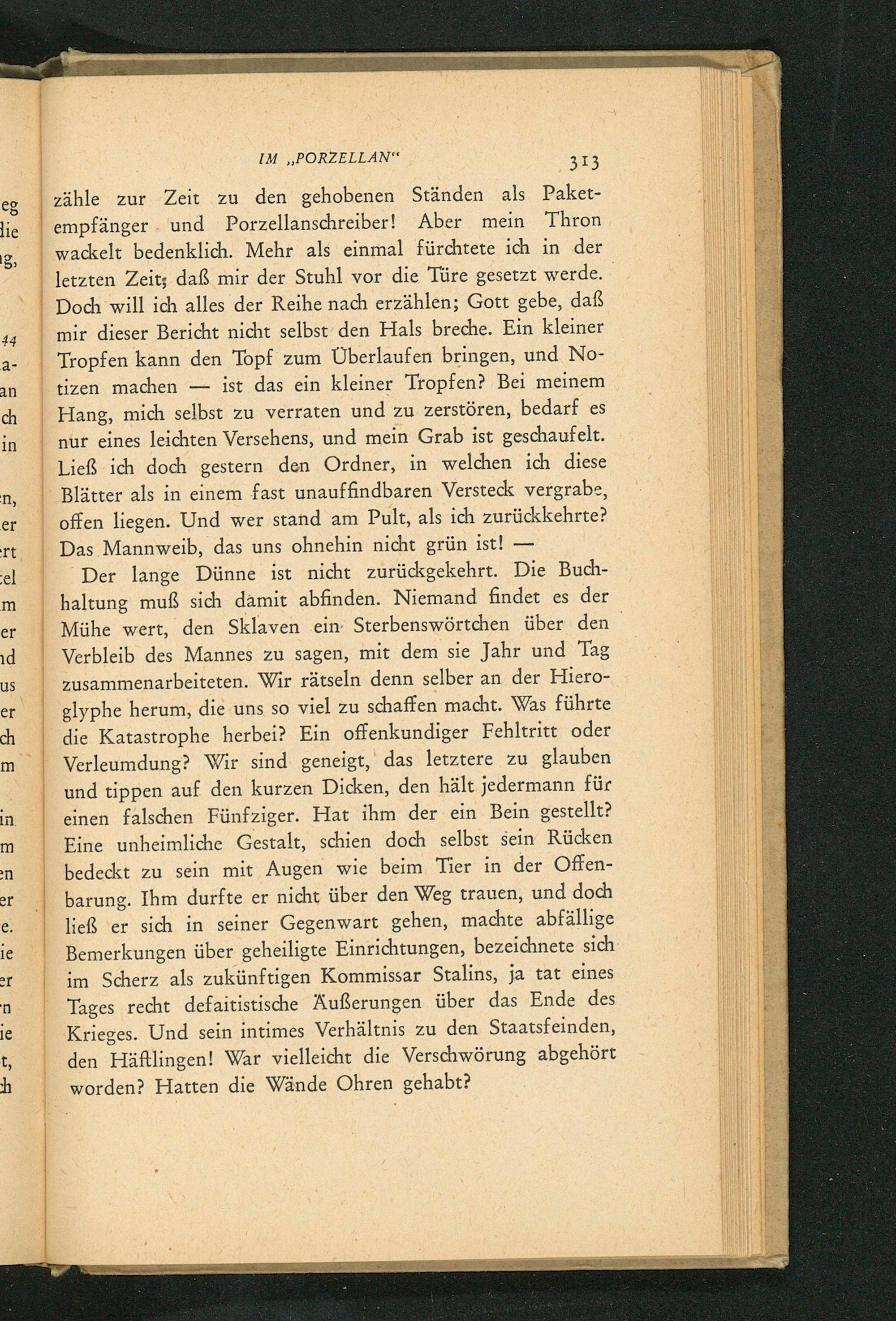Der lange Dünne ist nicht zurückgekehrt. Die Buch- haltung muß sich damit abfinden. Niemand findet es der Mühe wert, den Sklaven ein Sterbenswörtchen über den Verbleib des Mannes zu sagen, mit dem sie Jahr und Tag zusammenarbeiteten. Wir rätseln denn selber an der Hiero- glyphe herum, die uns so viel zu schaffen macht. Was führte die Katastrophe herbei? Ein offenkundiger Fehltritt oder Verleumdung? Wir sind geneigt, das letztere zu glauben und tippen auf den kurzen Dicken, den hält jedermann für einen falschen Fünfziger. Hat ihm der ein Bein gestellt? Eine unheimliche Gestalt, schien doch selbst sein Rücken bedeckt zu sein mit Augen wie beim Tier in der Offen- barung. Ihm durfte er nicht über den Weg trauen, und doch ließ er sich in seiner Gegenwart gehen, machte abfällige Bemerkungen über geheiligte Einrichtungen, bezeichnete sich im Scherz als zukünftigen Kommissar Stalins, ja tat eines Tages recht defaitistische Außerungen über das Ende des Krieges. Und sein intimes Verhältnis zu den Staatsfeinden, den Häftlingen! War vielleicht die Verschwörung abgehört worden? Hatten die Wände Ohren gehabt?