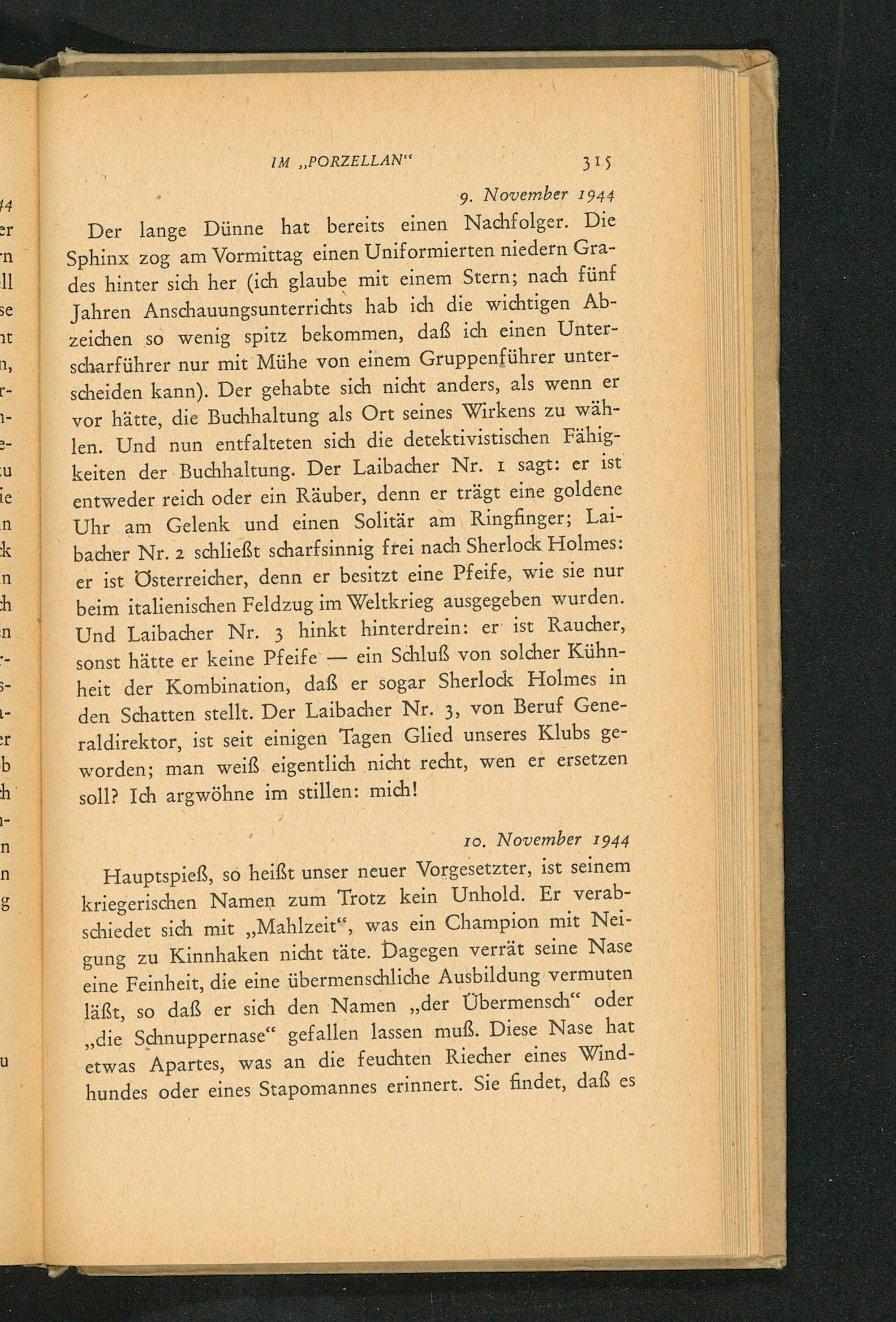 Der lange Dünne hat bereits einen Nachfolger. Die Sphinx zog am Vormittag einen Uniformierten niedern Grades hinter sich her( ich glaube mit einem Stern; nach fünf Jahren Anschauungsunterrichts hab ich die wichtigen Abzeichen so wenig spitz bekommen, daß ich einen Unterscharführer nur mit Mühe von einem Gruppenführer unterscheiden kann). Der gehabte sich nicht anders, als wenn er vor hätte, die Buchhaltung als Ort seines Wirkens zu wählen. Und nun entfalteten sich die detektivistischen Fähigkeiten der Buchhaltung. Der Laibacher Nr. I sagt: er ist entweder reich oder ein Räuber, denn er trägt eine goldene Uhr am Gelenk und einen Solitär am Ringfinger; Laibacher Nr. 2 schließt scharfsinnig frei nach Sherlock Holmes : er ist Österreicher, denn er besitzt eine Pfeife, wie sie nur beim italienischen Feldzug im Weltkrieg ausgegeben wurden. Und Laibacher Nr. 3 hinkt hinterdrein: er ist Raucher, sonst hätte er keine Pfeife ein Schluß von solcher Kühnheit der Kombination, daß er sogar Sherlock Holmes in den Schatten stellt. Der Laibacher Nr. 3, von Beruf Generaldirektor, ist seit einigen Tagen Glied unseres Klubs geworden; man weiß eigentlich nicht recht, wen er ersetzen soll? Ich argwöhne im stillen: mich!
