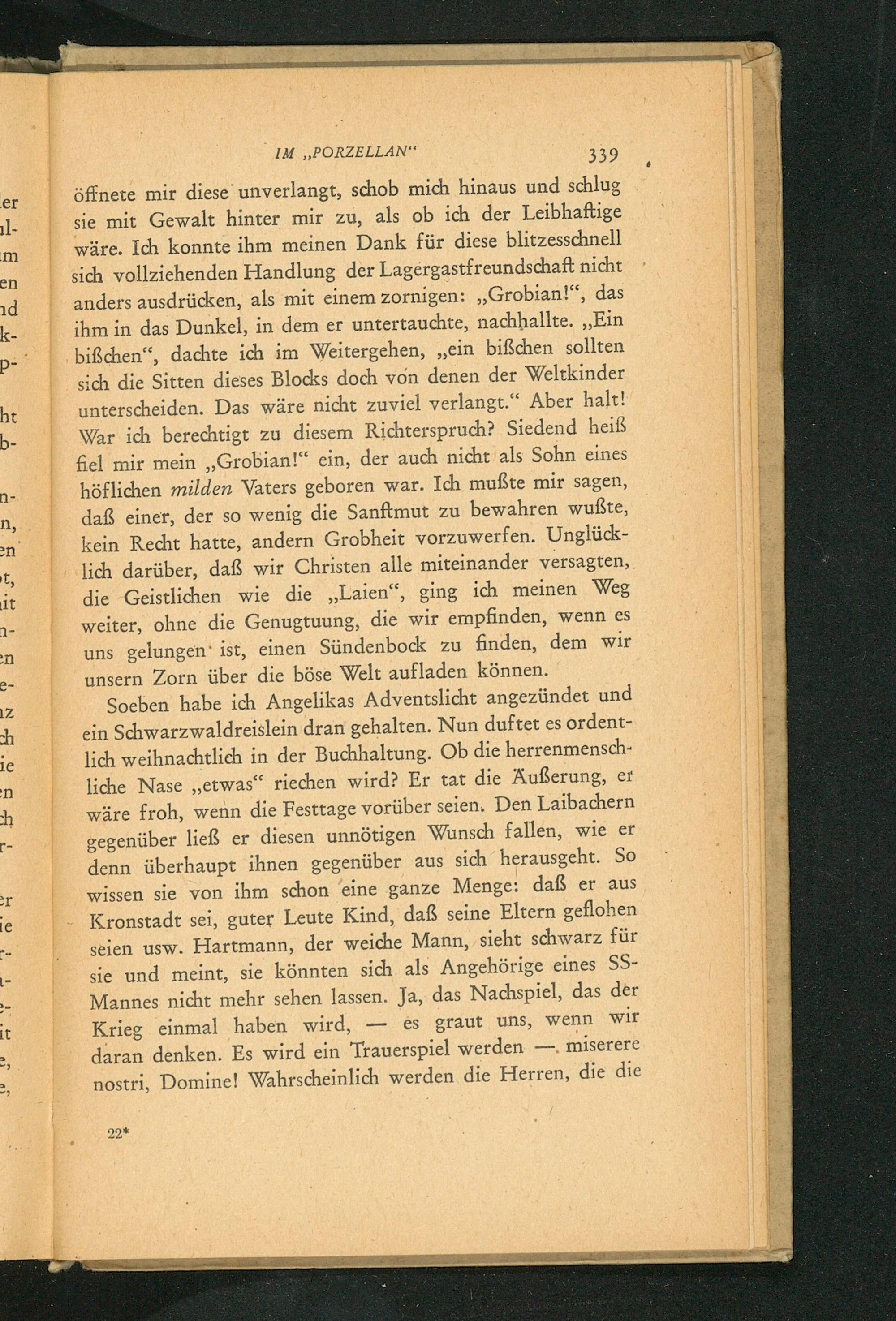 Soeben habe ich Angelikas Adventslicht angezündet und ein Schwarzwaldreislein dran gehalten. Nun duftet es ordent- lich weihnachtlich in der Buchhaltung. Ob die herrenmensch- liche Nase„etwas“ riechen wird? Er tat die Außerung, er wäre froh, wenn die Festtage vorüber seien. Den Laibachern gegenüber ließ er diesen unnötigen Wunsch fallen, wie er denn überhaupt ihnen gegenüber aus sich herausgeht. So wissen sie von ihm schon eine ganze Menge: daß er aus Kronstadt sei, guter Leute Kind, daß seine Eltern geflohen seien usw. Hartmann, der weiche Mann, sieht schwarz für sie und meint, sie könnten sich als Angehörige eines SS- Mannes nicht mehr sehen lassen. Ja, das Nachspiel, das der Krieg einmal haben wird,— es graut uns, wenn wir daran denken. Es wird ein Trauerspiel werden— miserere nostri, Domine! Wahrscheinlich werden die Herren, die die