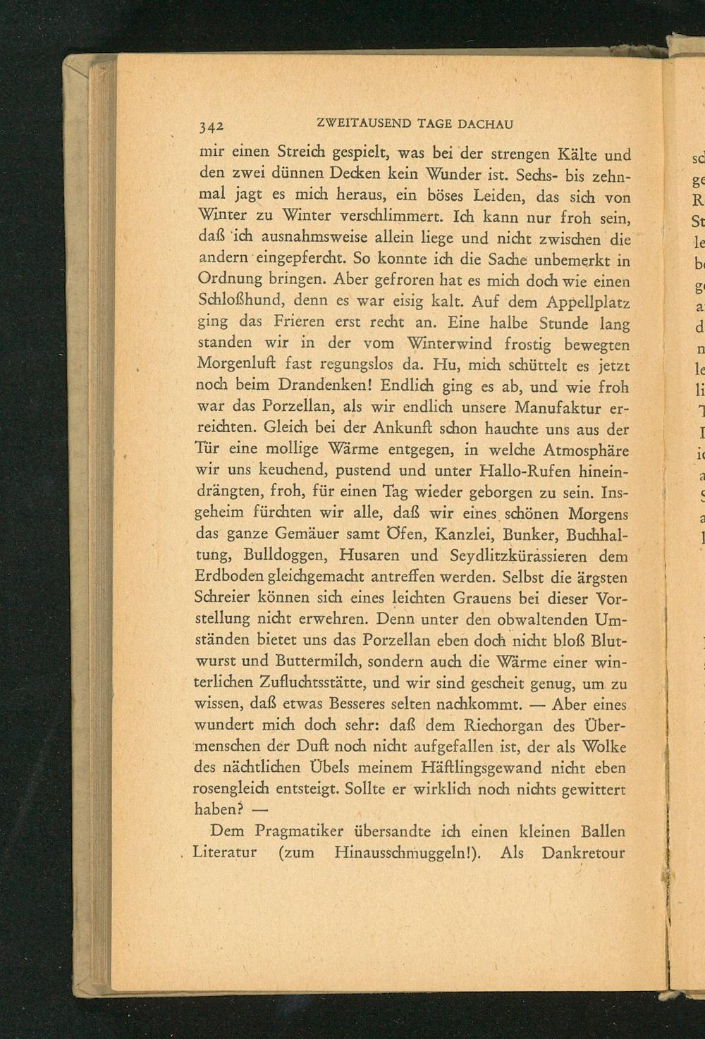 mir einen Streich gespielt, was bei der strengen Kälte und den zwei dünnen Decken kein Wunder ist. Sechs- bis zehn- mal jagt es mich heraus, ein böses Leiden, das sich von Winter zu Winter verschlimmert. Ich kann nur froh sein, daß‘ich ausnahmsweise allein liege und nicht zwischen die andern'eingepfercht. So konnte ich die Sache unbemerkt in Ordnung bringen. Aber gefroren hat es mich doch wie einen Schloßhund, denn es war eisig kalt. Auf dem Appellplatz ging das Frieren erst recht an. Eine halbe Stunde lang standen wir in der vom Winterwind frostig bewegten Morgenluft fast regungslos da. Hu, mich schüttelt es jetzt noch beim Drandenken! Endlich ging es ab, und wie froh war das Porzellan, als wir endlich unsere Manufaktur er- reichten. Gleich bei der Ankunft schon hauchte uns aus der Tür eine mollige Wärme entgegen, in welche Atmosphäre wir uns keuchend, pustend und unter Hallo-Rufen hinein- drängten, froh, für einen Tag wieder geborgen zu sein. Ins- geheim fürchten wir alle, daß wir eines schönen Morgens das ganze Gemäuer samt Ofen, Kanzlei, Bunker, Buchhal- tung, Bulldoggen, Husaren und Seydlitzkürassieren dem Erdboden gleichgemacht antreffen werden. Selbst die ärgsten Schreier können sich eines leichten Grauens bei dieser Vor- stellung nicht erwehren. Denn unter den obwaltenden Um- ständen bietet uns das Porzellan eben doch nicht bloß Blut- wurst und Buttermilch, sondern auch die Wärme einer win- terlichen Zufluchtsstätte, und wir sind gescheit genug, um zu wissen, daß etwas Besseres selten nachkommt.— Aber eines wundert mich doch sehr: daß dem Riechorgan des Über- menschen der Duft noch nicht aufgefallen ist, der als Wolke des nächtlichen Übels meinem Häftlingsgewand nicht eben rosengleich entsteigt. Sollte er wirklich noch nichts gewittert haben?—