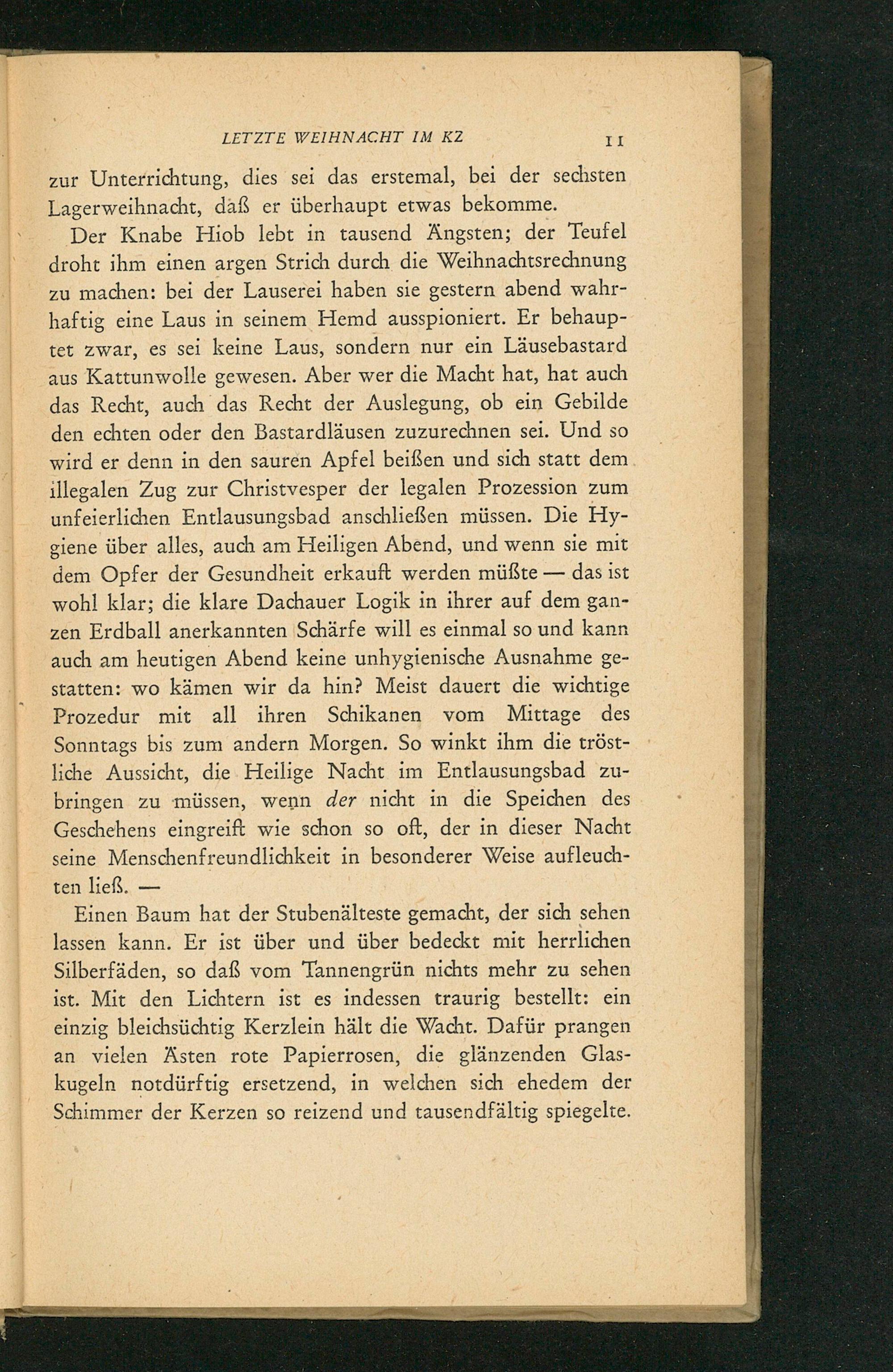 Der Knabe Hiob lebt in tausend Ängsten; der Teufel droht ihm einen argen Strich durch die Weihnachtsrechnung zu machen: bei der Lauserei haben sie gestern abend wahrhaftig eine Laus in seinem Hemd ausspioniert. Er behauptet zwar, es sei keine Laus, sondern nur ein Läusebastard aus Kattunwolle gewesen. Aber wer die Macht hat, hat auch das Recht, auch das Recht der Auslegung, ob ein Gebilde den echten oder den Bastardläusen zuzurechnen sei. Und so wird er denn in den sauren Apfel beißen und sich statt dem illegalen Zug zur Christvesper der legalen Prozession zum unfeierlichen Entlausungsbad anschließen müssen. Die Hygiene über alles, auch am Heiligen Abend, und wenn sie mit dem Opfer der Gesundheit erkauft werden müßte- das ist wohl klar; die klare Dachauer Logik in ihrer auf dem ganzen Erdball anerkannten Schärfe will es einmal so und kann auch am heutigen Abend keine unhygienische Ausnahme gestatten: wo kämen wir da hin? Meist dauert die wichtige Prozedur mit all ihren Schikanen vom Mittage des Sonntags bis zum andern Morgen. So winkt ihm die tröstliche Aussicht, die Heilige Nacht im Entlausungsbad zubringen zu müssen, wenn der nicht in die Speichen des Geschehens eingreift wie schon so oft, der in dieser Nacht seine Menschenfreundlichkeit in besonderer Weise aufleuchten ließ.