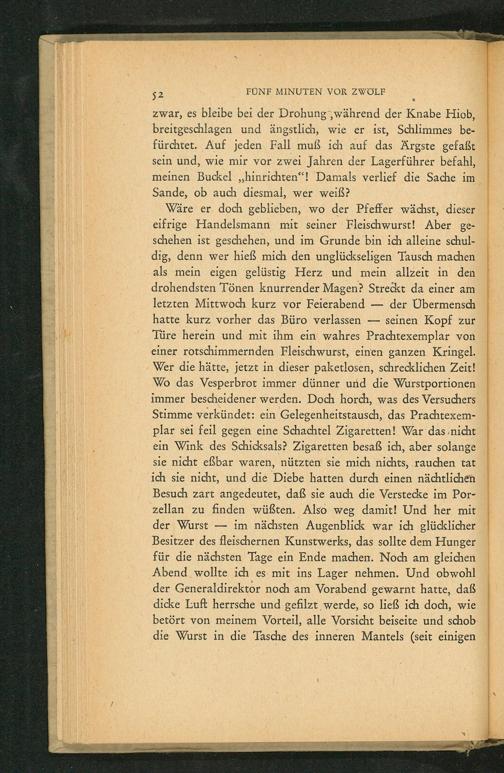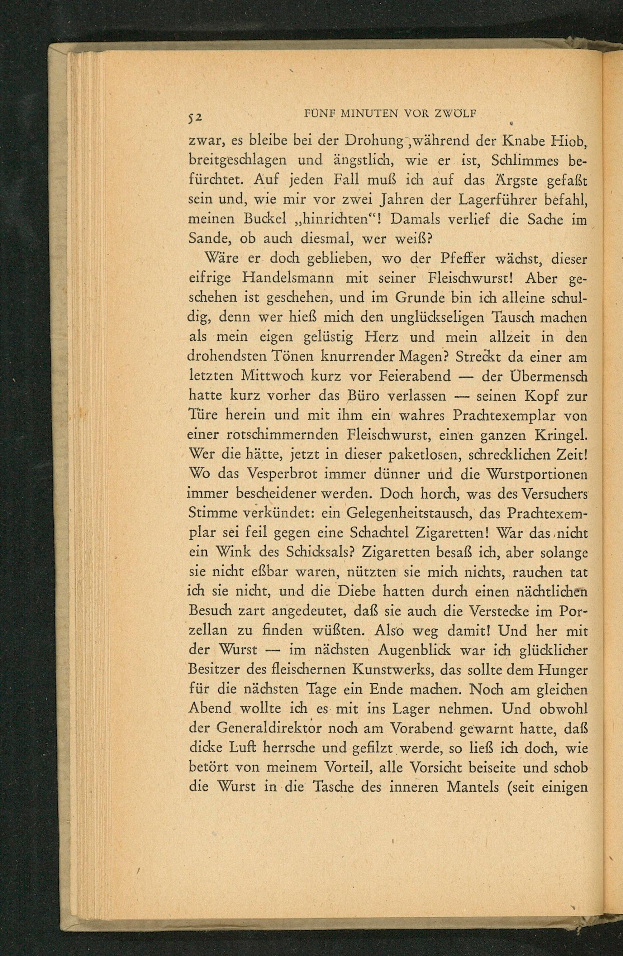 Wäre er doch geblieben, wo der Pfeffer wächst, dieser eifrige Handelsmann mit seiner Fleischwurst! Aber geschehen ist geschehen, und im Grunde bin ich alleine schuldig, denn wer hieß mich den unglückseligen Tausch machen als mein eigen gelüstig Herz und mein allzeit in den drohendsten Tönen knurrender Magen? Streckt da einer am letzten Mittwoch kurz vor Feierabend der Übermensch hatte kurz vorher das Büro verlassen seinen Kopf zur Türe herein und mit ihm ein wahres Prachtexemplar von einer rotschimmernden Fleischwurst, einen ganzen Kringel. Wer die hätte, jetzt in dieser paketlosen, schrecklichen Zeit! Wo das Vesperbrot immer dünner und die Wurstportionen immer bescheidener werden. Doch horch, was des Versuchers Stimme verkündet: ein Gelegenheitstausch, das Prachtexemplar sei feil gegen eine Schachtel Zigaretten! War das nicht ein Wink des Schicksals? Zigaretten besaß ich, aber solange sie nicht eßbar waren, nützten sie mich nichts, rauchen tat ich sie nicht, und die Diebe hatten durch einen nächtlichen Besuch zart angedeutet, daß sie auch die Verstecke im Porzellan zu finden wüßten. Also weg damit! Und her mit der Wurst im nächsten Augenblick war ich glücklicher Besitzer des fleischernen Kunstwerks, das sollte dem Hunger für die nächsten Tage ein Ende machen. Noch am gleichen Abend wollte ich es mit ins Lager nehmen. Und obwohl der Generaldirektor noch am Vorabend gewarnt hatte, daß dicke Luft herrsche und gefilzt werde, so ließ ich doch, wie betört von meinem Vorteil, alle Vorsicht beiseite und schob die Wurst in die Tasche des inneren Mantels( seit einigen