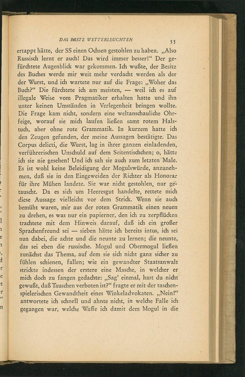 ertappt hätte, der SS einen Ochsen gestohlen zu haben.„Also Russisch lernt er auch! Das wird immer besser!“ Der ge- fürchtete Augenblick war gekommen. Ich wußte, der Besitz des Buches werde mir weit mehr verdacht werden als der der Wurst, und ich wartete nur auf die Frage:„Woher das Buch?“ Die fürchtete ich am meisten,— weil ich es auf illegale Weise vom Pragmatiker erhalten hatte und ihn. unter keinen Umständen in Verlegenheit bringen wollte. Die Frage kam nicht, sondern eine weltanschauliche Ohr- feige, worauf sie mich laufen ließen samt rotem Hals- tuch, aber ohne rote Grammatik. In kurzem hatte ich den Zeugen gefunden, der meine Aussagen bestätigte. Das Corpus delicti, die Wurst, lag in ihrer ganzen einladenden, verführerischen Unschuld auf dem Seitentischchen; o, hätte ich sie nie gesehen! Und ich sah sie auch zum letzten Male. Es ist wohl keine Beleidigung der Mogulswürde, anzuneh- men, daß sie in den Eingeweiden der Richter als Honorar für ihre Mühen landete. Sie war nicht gestohlen, nur ge- tauscht. Da es sich um Heeresgut handelte, rettete mich diese Aussage vielleicht vor dem Strick. Wenn sie auch bemüht waren, mir aus der roten Grammatik einen neuen zu drehen, es was nur ein papierner, den ich zu zerpflücken trachtete mit dem Hinweis, darauf, daß ich ein großer Sprachenfreund sei— sieben hätte ich bereits intus, ich sei nun dabei, die achte und die neunte zu lernen; die neunte, das sei eben die russische. Mogul und Obermogul ließen zunächst das T’hema, auf dem sie sich nicht ganz sicher zu fühlen schienen, fallen; wie ein gewandter Staatsanwalt strickte indessen der erstere eine Masche, in welcher er mich doch zu fangen gedachte:„Sag’ einmal, hast du ‚nicht gewußt, daß Tauschen verboten ist?“ fragte er mit der taschen- spielerischen Gewandtheit eines Winkeladvokaten.„Nein!“ antwortete ich schnell und ahnte nicht, in welche Falle ich gegangen war, welche Waffe ich damit dem Mogul in die