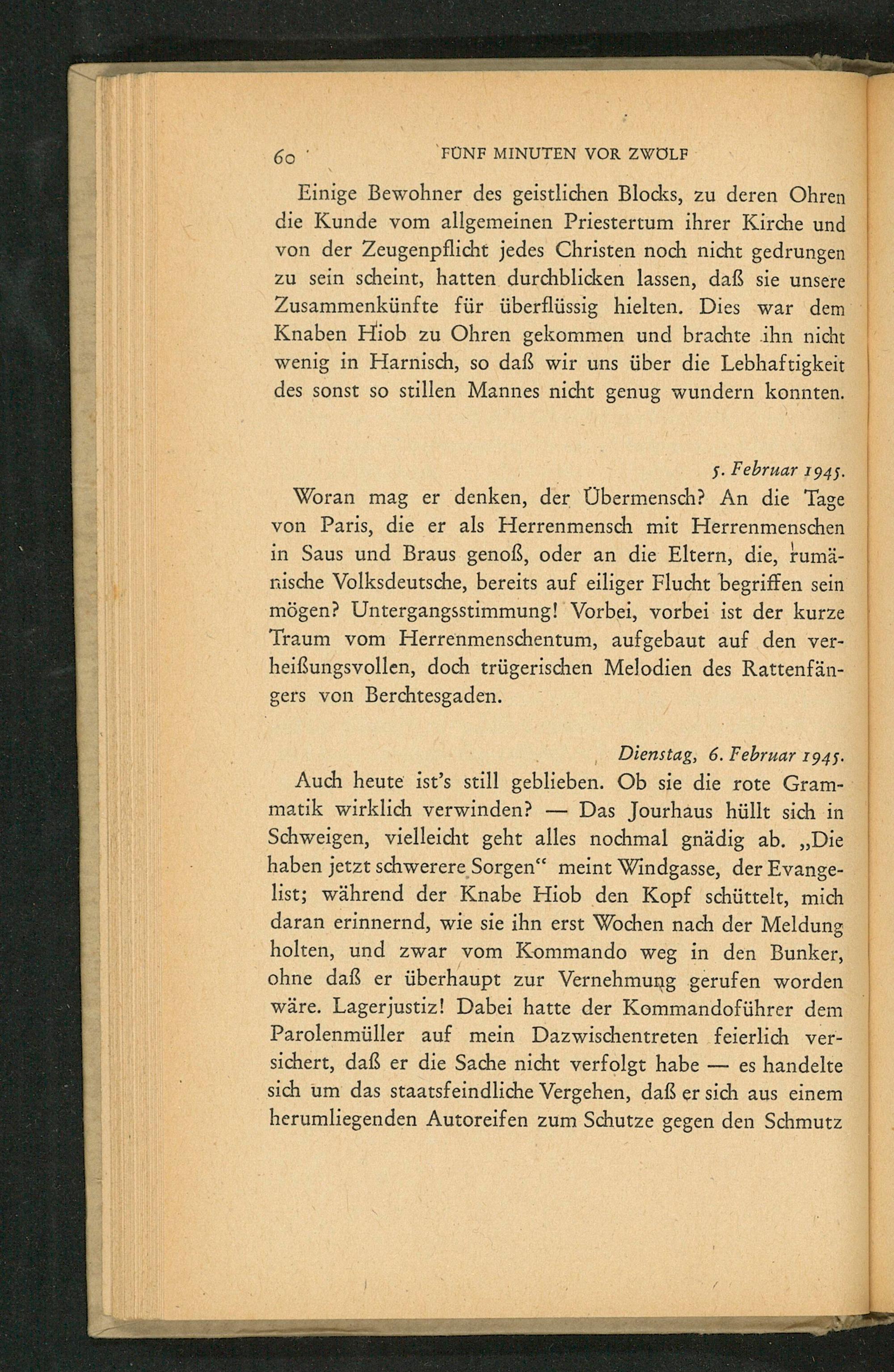 Auch heute ist's still geblieben. Ob sie die rote Grammatik wirklich verwinden? Das Jourhaus hüllt sich in Schweigen, vielleicht geht alles nochmal gnädig ab. ,, Die haben jetzt schwerere Sorgen" meint Windgasse, der Evangelist; während der Knabe Hiob den Kopf schüttelt, mich daran erinnernd, wie sie ihn erst Wochen nach der Meldung holten, und zwar vom Kommando weg in den Bunker, ohne daß er überhaupt zur Vernehmung gerufen worden wäre. Lagerjustiz! Dabei hatte der Kommandoführer dem Parolenmüller auf mein Dazwischentreten feierlich versichert, daß er die Sache nicht verfolgt habe es handelte sich um das staatsfeindliche Vergehen, daß er sich aus einem herumliegenden Autoreifen zum Schutze gegen den Schmutz