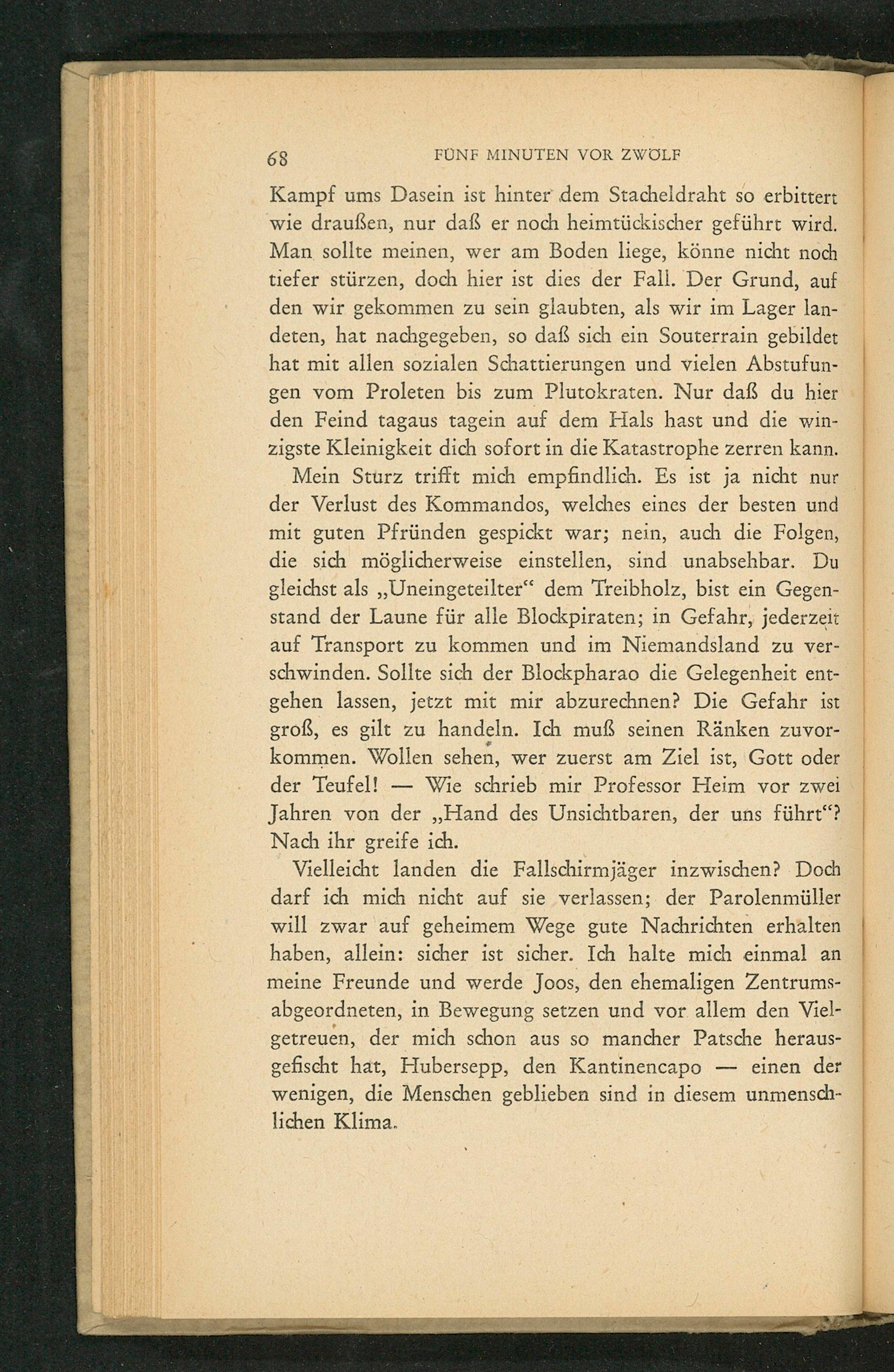 Vielleicht landen die Fallschirmjäger inzwischen? Doch darf ich mich nicht auf sie verlassen; der Parolenmüller will zwar auf geheimem Wege gute Nachrichten erhalten haben, allein: sicher ist sicher. Ich halte mich einmal an meine Freunde und werde Joos, den ehemaligen Zentrumsabgeordneten, in Bewegung setzen und vor allem den Vielgetreuen, der mich schon aus so mancher Patsche herausgefischt hat, Hubersepp, den Kantinencapo einen der wenigen, die Menschen geblieben sind in diesem unmenschlichen Klima.
