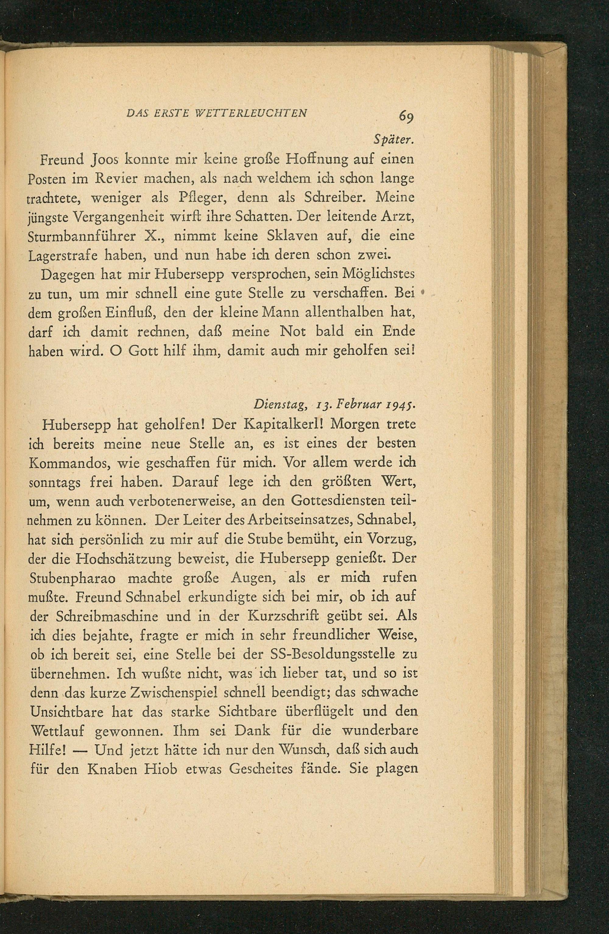 Hubersepp hat geholfen! Der Kapitalkerl! Morgen trete ich bereits meine neue Stelle an, es ist eines der besten Kommandos, wie geschaffen für mich. Vor allem werde ich sonntags frei haben. Darauf lege ich den größten Wert, um, wenn auch verbotenerweise, an den Gottesdiensten teil- nehmen zu können. Der Leiter des Arbeitseinsatzes, Schnabel, hat sich persönlich zu mir auf die Stube bemüht, ein Vorzug, der die Hochschätzung beweist, die Hubersepp genießt. Der Stubenpharao machte große Augen, als er mich rufen mußte. Freund Schnabel erkundigte sich bei mir, ob ich auf der Schreibmaschine und in der Kurzschrift geübt sei. Als ich dies bejahte, fragte er mich in sehr freundlicher Weise, ob ich bereit sei, eine Stelle bei der SS-Besoldungsstelle zu übernehmen. Ich wußte nicht, was’ich lieber tat, und so ist denn.das kurze Zwischenspiel schnell beendigt; das schwache Unsichtbare hat das starke Sichtbare überflügelt und den Wettlauf gewonnen. Ihm sei Dank für die wunderbare Hilfe!— Und jetzt hätte ich nur den Wunsch, daß sich auch für den Knaben Hiob etwas Gescheites fände. Sie plagen