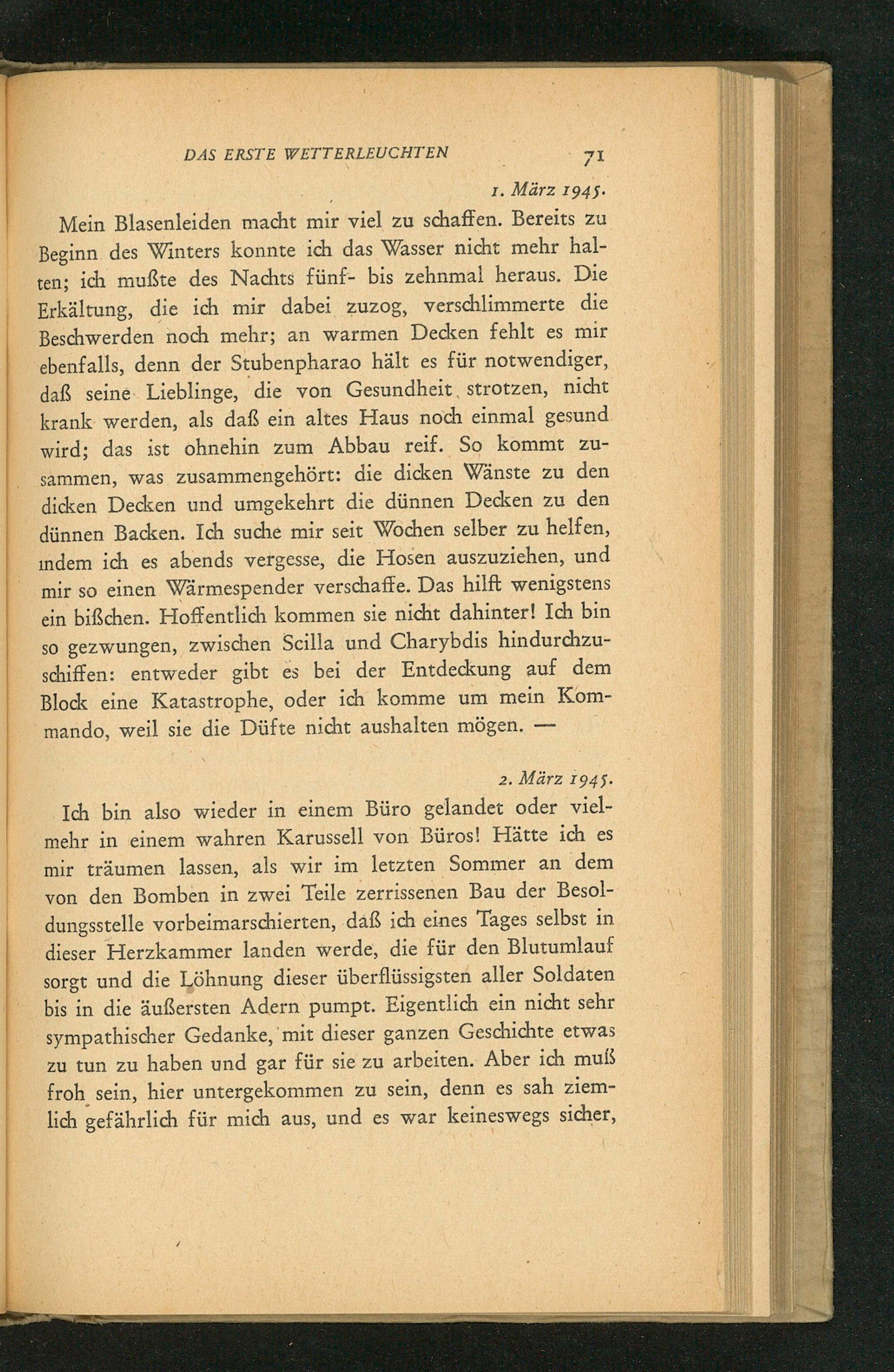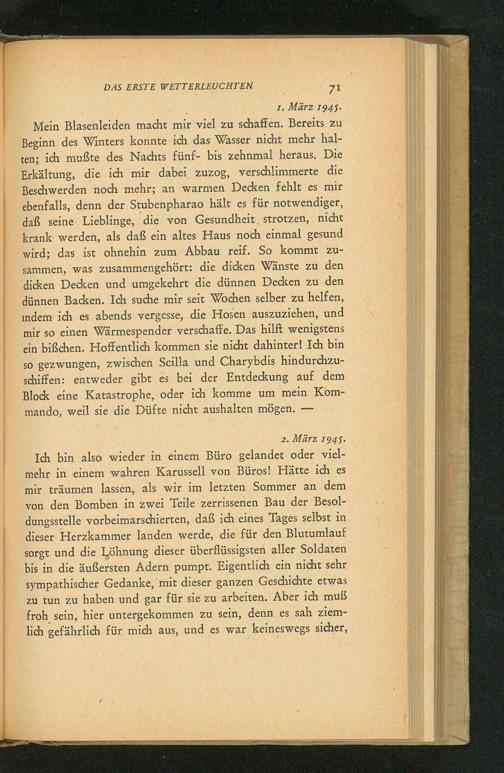 Ich bin also wieder in einem Büro gelandet oder vielmehr in einem wahren Karussell von Büros! Hätte ich es mir träumen lassen, als wir im letzten Sommer an dem von den Bomben in zwei Teile zerrissenen Bau der Besoldungsstelle vorbeimarschierten, daß ich eines Tages selbst in dieser Herzkammer landen werde, die für den Blutumlauf sorgt und die Löhnung dieser überflüssigsten aller Soldaten bis in die äußersten Adern pumpt. Eigentlich ein nicht sehr sympathischer Gedanke, mit dieser ganzen Geschichte etwas zu tun zu haben und gar für sie zu arbeiten. Aber ich muß froh sein, hier untergekommen zu sein, denn es sah ziemlich gefährlich für mich aus, und es war keineswegs sicher,
