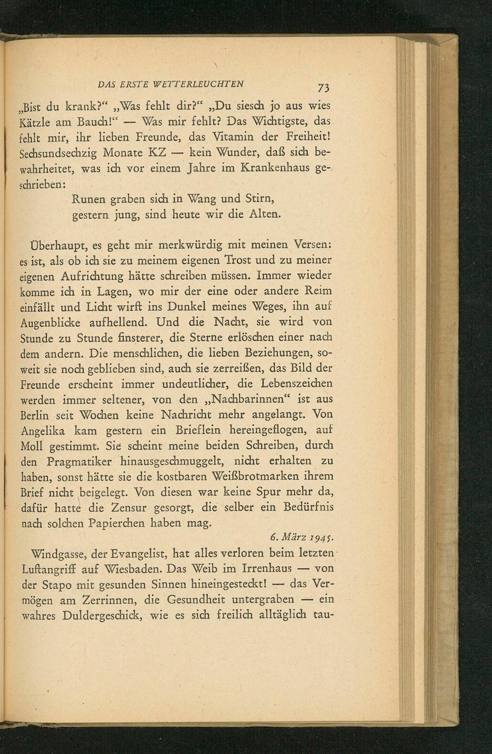 ,, Bist du krank?" ,, Was fehlt dir?" ,, Du siesch jo aus wies Kätzle am Bauch!" Was mir fehlt? Das Wichtigste, das fehlt mir, ihr lieben Freunde, das Vitamin der Freiheit! Sechsundsechzig Monate KZ- kein Wunder, daß sich bewahrheitet, was ich vor einem Jahre im Krankenhaus geschrieben: