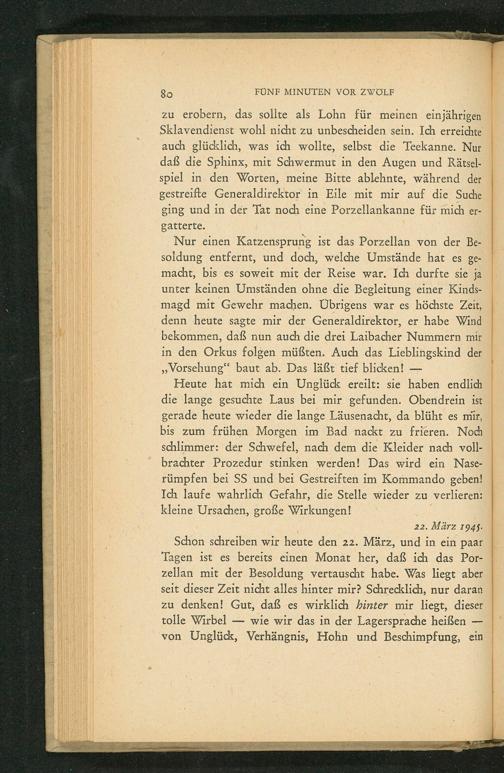 Schon schreiben wir heute den 22. März, und in ein paar Tagen ist es bereits einen Monat her, daß ich das Porzellan mit der Besoldung vertauscht habe. Was liegt aber seit dieser Zeit nicht alles hinter mir? Schrecklich, nur daran zu denken! Gut, daß es wirklich hinter mir liegt, dieser tolle Wirbel wie wir das in der Lagersprache heißen-- von Unglück, Verhängnis, Hohn und Beschimpfung, ein