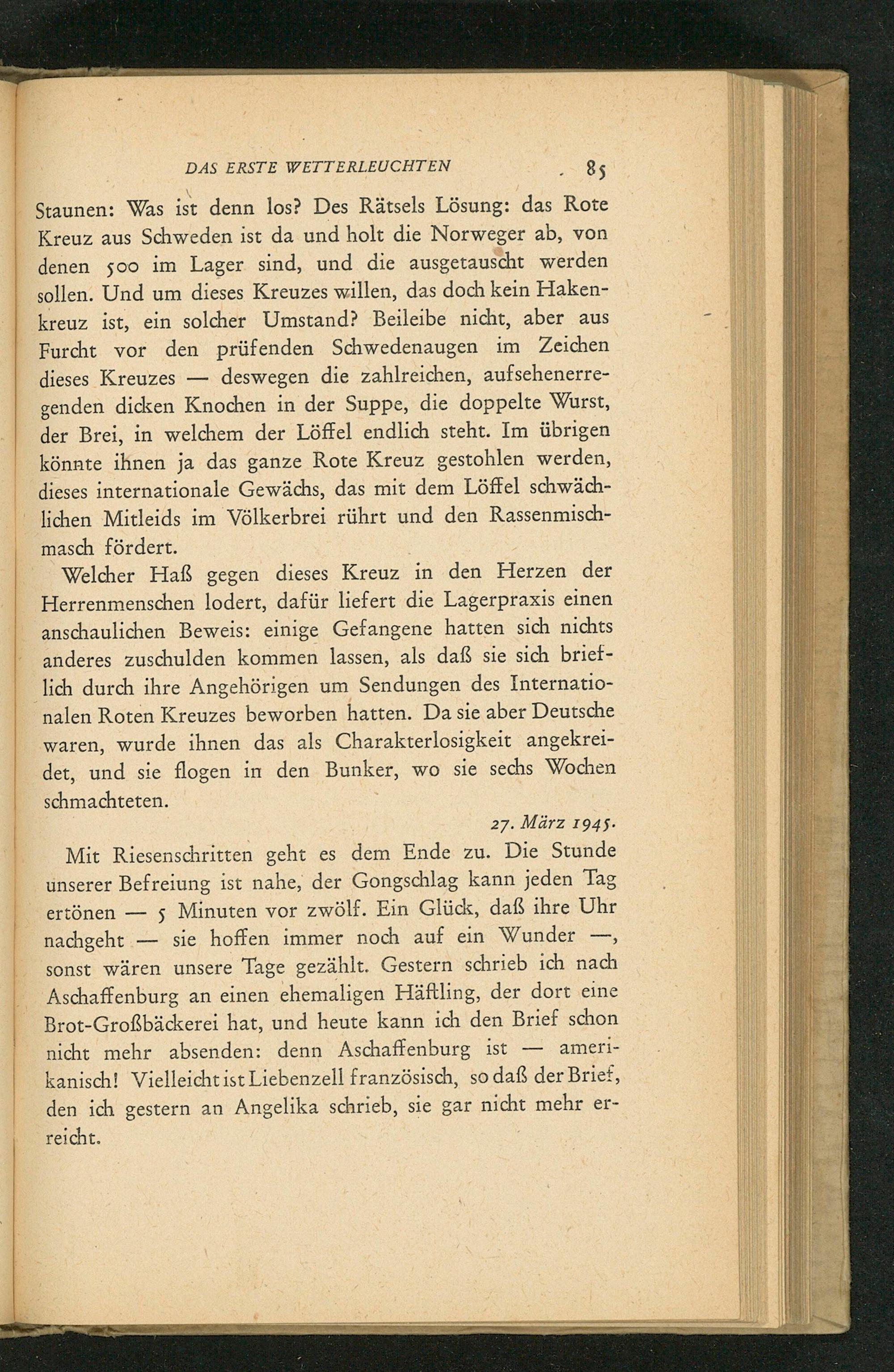 Welcher Haß gegen dieses Kreuz in den Herzen der Herrenmenschen lodert, dafür liefert die Lagerpraxis einen anschaulichen Beweis: einige Gefangene hatten sich nichts anderes zuschulden kommen lassen, als daß sie sich brieflich durch ihre Angehörigen um Sendungen des Internationalen Roten Kreuzes beworben hatten. Da sie aber Deutsche waren, wurde ihnen das als Charakterlosigkeit angekreidet, und sie flogen in den Bunker, wo sie sechs Wochen schmachteten.